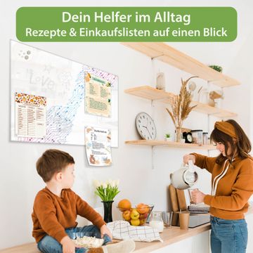 Auf der glatten Glasoberfläche lassen sich Termine, Rezepte oder Notizen ganz einfach mit Kreidestiften festhalten und rückstandslos entfernen. Starke Neodym-Magnete halten Ihre wichtigsten Erinnerungen sicher an Ort und Stelle. So entsteht Ihre ganz persönliche Ideenwand - jeden Tag neu.