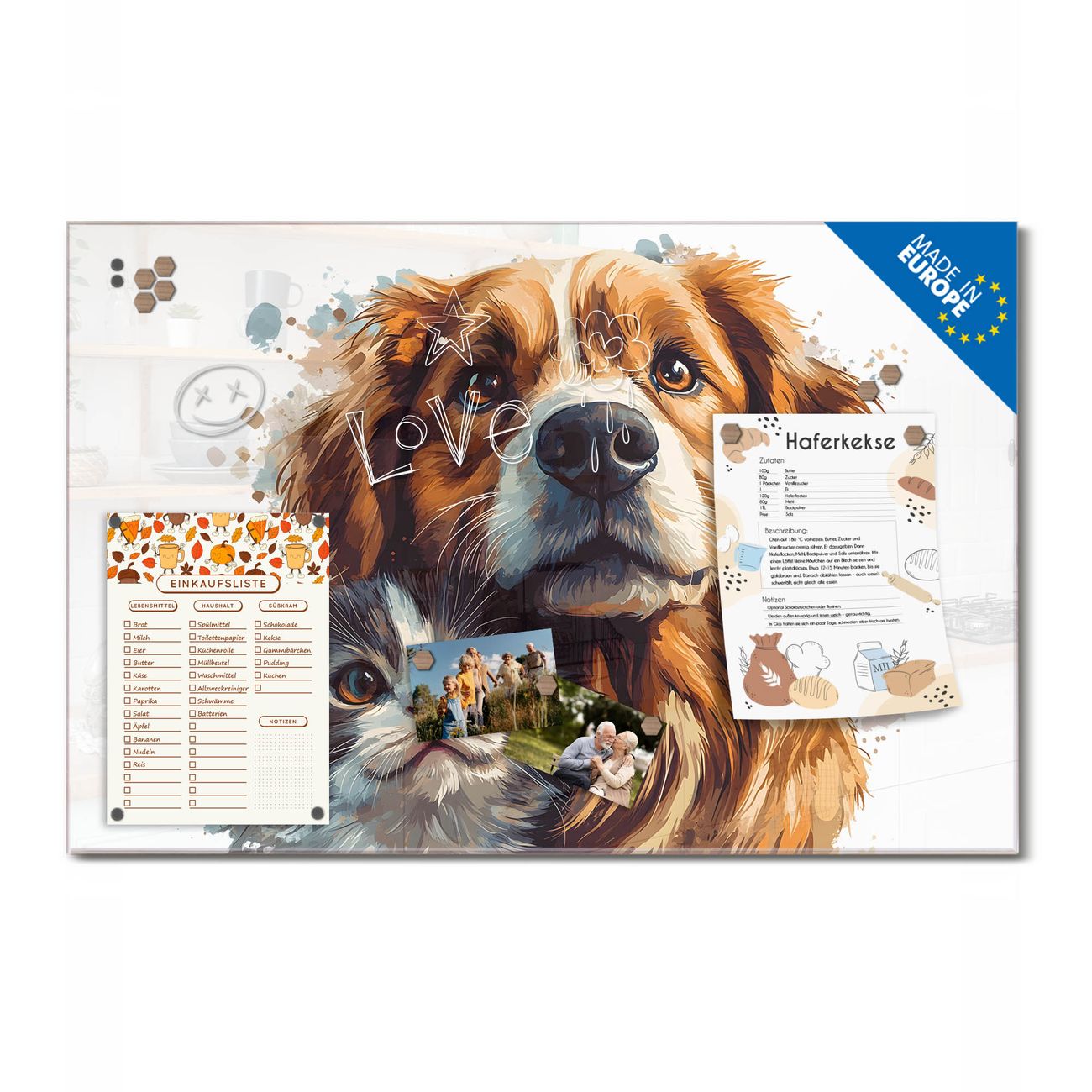 Ein Stück Design, das Ihren Alltag organisiert. Schreiben, heften, inspirieren - alles an einem Ort. Qualität, die man spürt. Montage leicht gemacht. Handwerk mit Herz - veredelt in Sachsen. Einzigartiges Design mit Motiv Motiv Tierische Begleiter Beschreibbare Glasoberfläche, leicht zu reinigen Starke Magnetkraft durch Stahlrückwand Inklusive 4 Neodym-Magneten Flexible Montageoptionen Handveredelt in Sachsen - Qualität, die bleibt