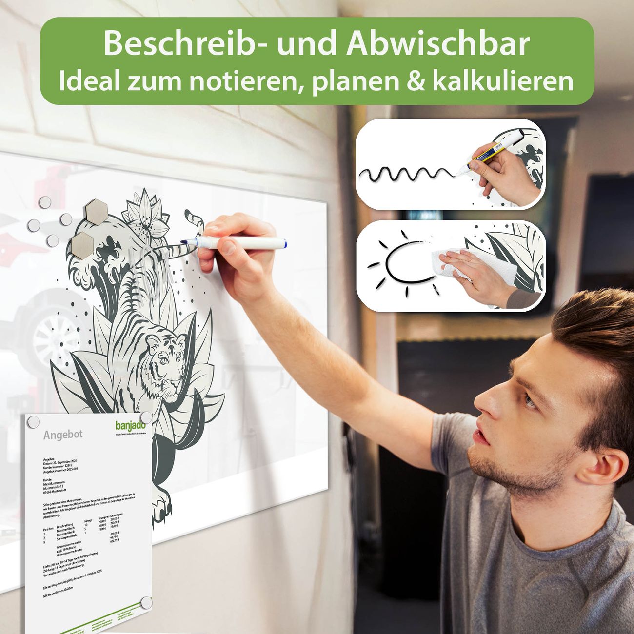 Jede Glas Magnettafel wird in unserer Werkstatt von Hand gefertigt und sorgfältig geprüft. So erhalten Sie ein echtes Qualitätsprodukt, das Funktion und Ästhetik perfekt vereint.?? Warum banjado?
