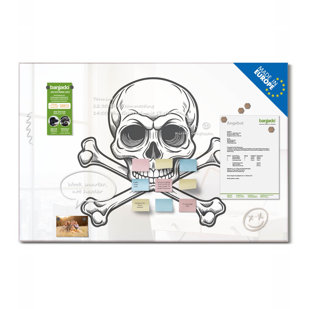 Ein Stück Design, das Ihren Alltag organisiert. Schreiben, heften, inspirieren - alles an einem Ort. Qualität, die man spürt. Montage leicht gemacht. Handwerk mit Herz - veredelt in Sachsen. Einzigartiges Design mit Motiv Motiv Totenkopfsymbol Beschreibbare Glasoberfläche, leicht zu reinigen Starke Magnetkraft durch Stahlrückwand Inklusive 4 Neodym-Magneten Flexible Montageoptionen Handveredelt in Sachsen - Qualität, die bleibt