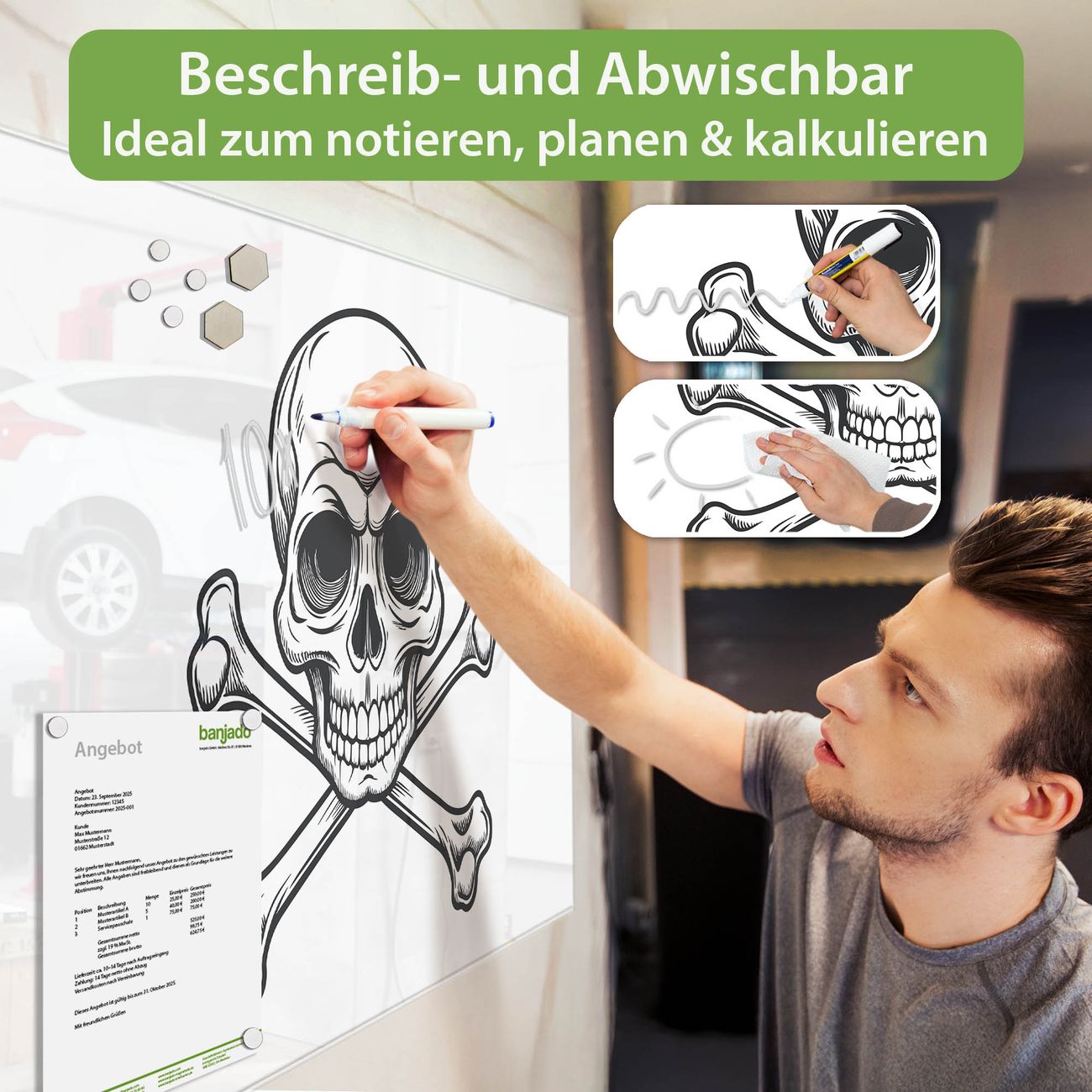 Die banjado Glas Magnettafel mit dem Motiv Motiv Totenkopfsymbol verbindet Funktionalität mit Stil. Sie ersetzt das Zettelchaos durch klare Strukturen und bringt dabei eine warme, natürliche Atmosphäre in Ihr Zuhause. Ob im Büro, in der Küche oder im Eingangsbereich - dieses Design-Board zieht Blicke an und sorgt für Ordnung mit Charakter.