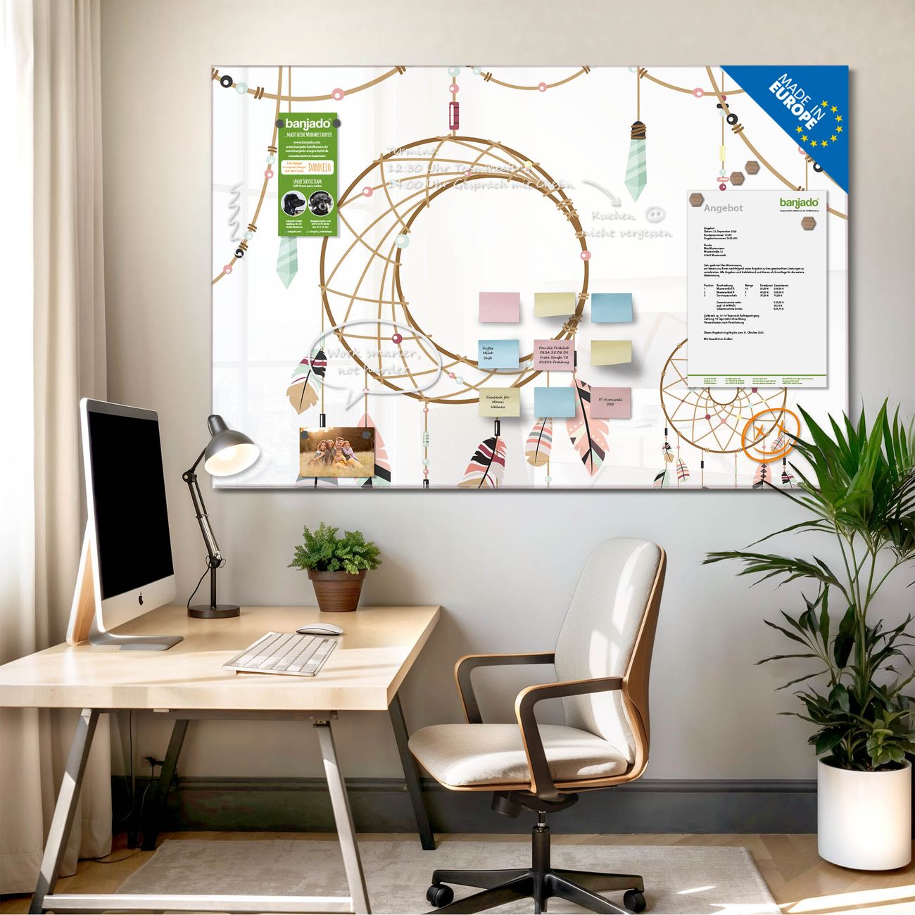 Ein Stück Design, das Ihren Alltag organisiert. Schreiben, heften, inspirieren - alles an einem Ort. Qualität, die man spürt. Montage leicht gemacht. Handwerk mit Herz - veredelt in Sachsen. Einzigartiges Design mit Motiv Motiv Traumfänger Eleganz Beschreibbare Glasoberfläche, leicht zu reinigen Starke Magnetkraft durch Stahlrückwand Inklusive 4 Neodym-Magneten Flexible Montageoptionen Handveredelt in Sachsen - Qualität, die bleibt