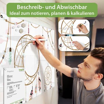 Die banjado Glas Magnettafel mit dem Motiv Motiv Traumfänger Eleganz verbindet Funktionalität mit Stil. Sie ersetzt das Zettelchaos durch klare Strukturen und bringt dabei eine warme, natürliche Atmosphäre in Ihr Zuhause. Ob im Büro, in der Küche oder im Eingangsbereich - dieses Design-Board zieht Blicke an und sorgt für Ordnung mit Charakter.