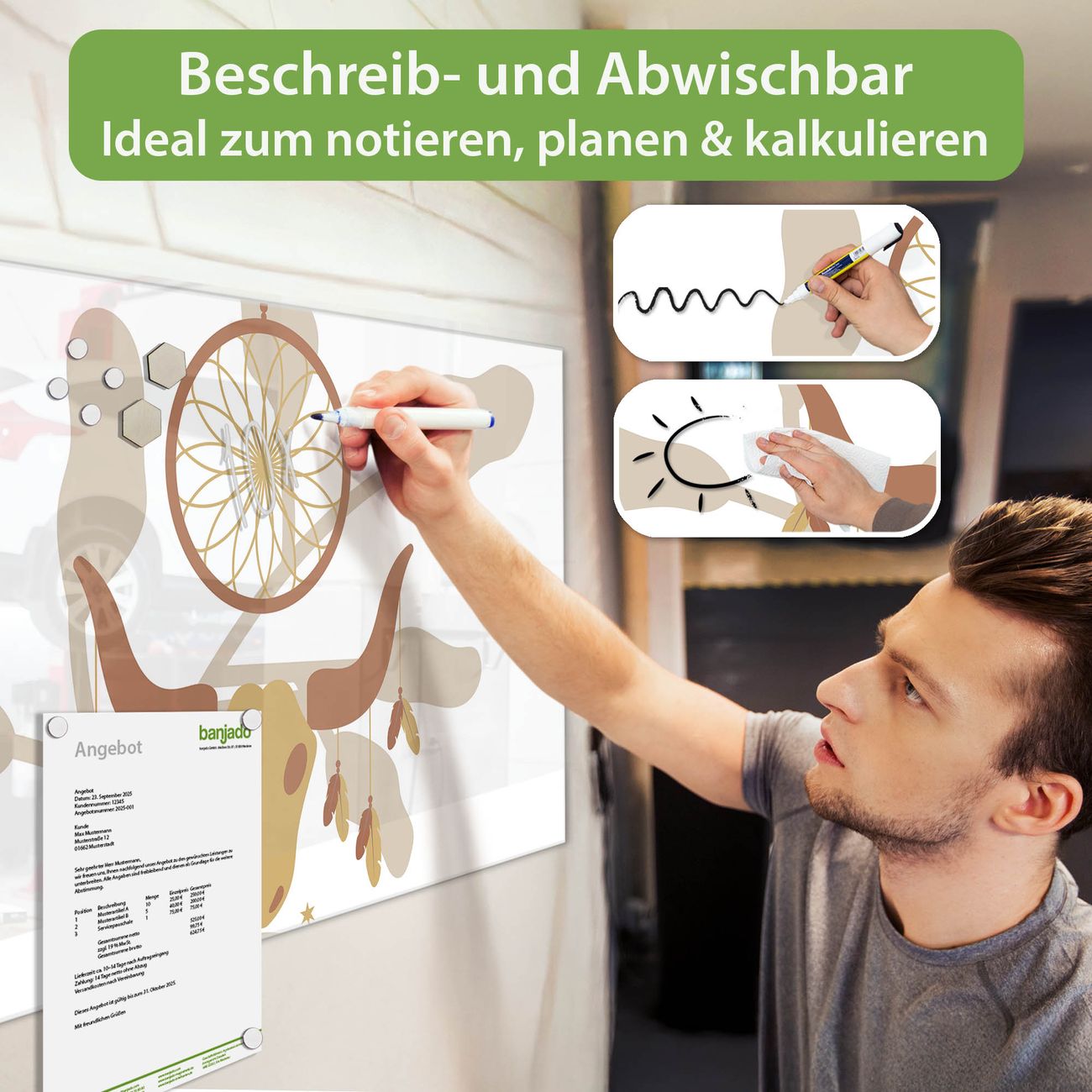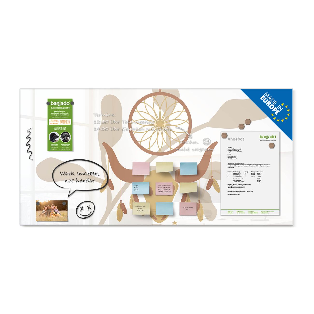 Die banjado Glas Magnettafel mit dem Motiv Motiv Traumfänger Mond und Federn verbindet Funktionalität mit Stil. Sie ersetzt das Zettelchaos durch klare Strukturen und bringt dabei eine warme, natürliche Atmosphäre in Ihr Zuhause. Ob im Büro, in der Küche oder im Eingangsbereich - dieses Design-Board zieht Blicke an und sorgt für Ordnung mit Charakter.