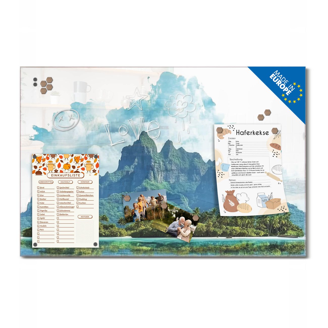 Ein Stück Design, das Ihren Alltag organisiert. Schreiben, heften, inspirieren - alles an einem Ort. Qualität, die man spürt. Montage leicht gemacht. Handwerk mit Herz - veredelt in Sachsen. Einzigartiges Design mit Motiv Motiv Tropenparadies Beschreibbare Glasoberfläche, leicht zu reinigen Starke Magnetkraft durch Stahlrückwand Inklusive 4 Neodym-Magneten Flexible Montageoptionen Handveredelt in Sachsen - Qualität, die bleibt