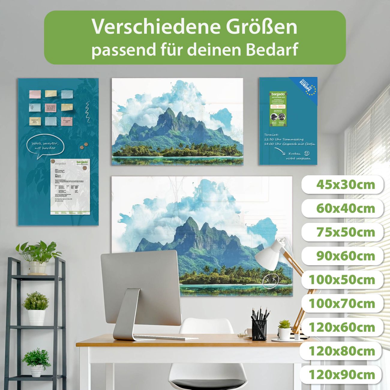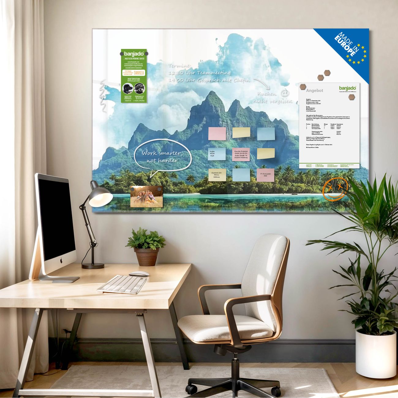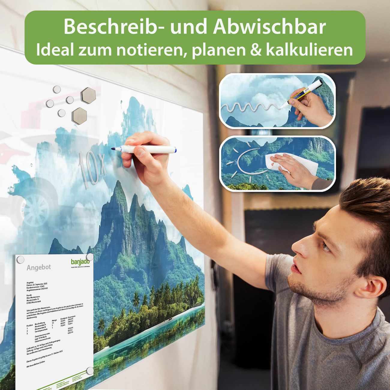Jede Glas Magnettafel wird in unserer Werkstatt von Hand gefertigt und sorgfältig geprüft. So erhalten Sie ein echtes Qualitätsprodukt, das Funktion und Ästhetik perfekt vereint.?? Warum banjado?