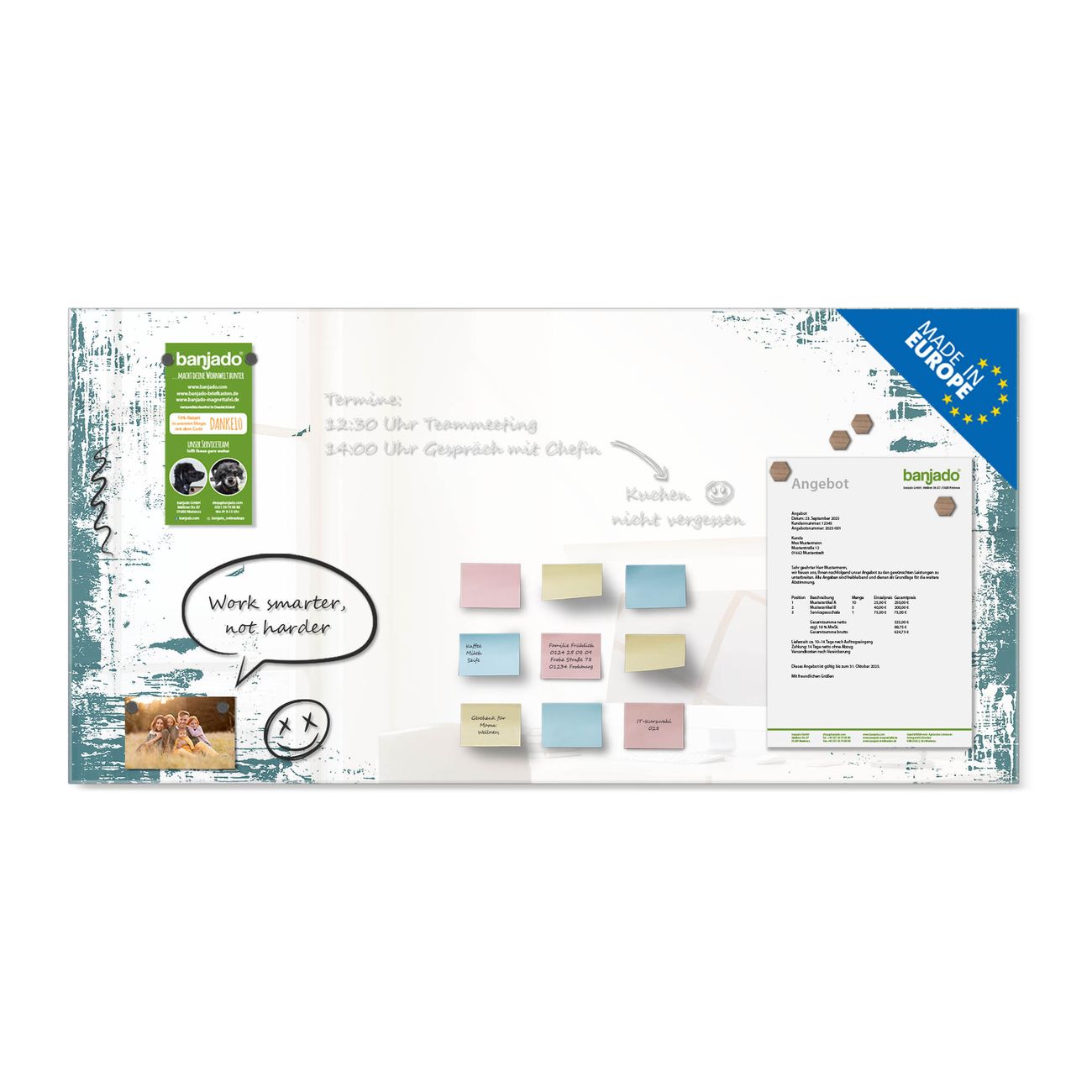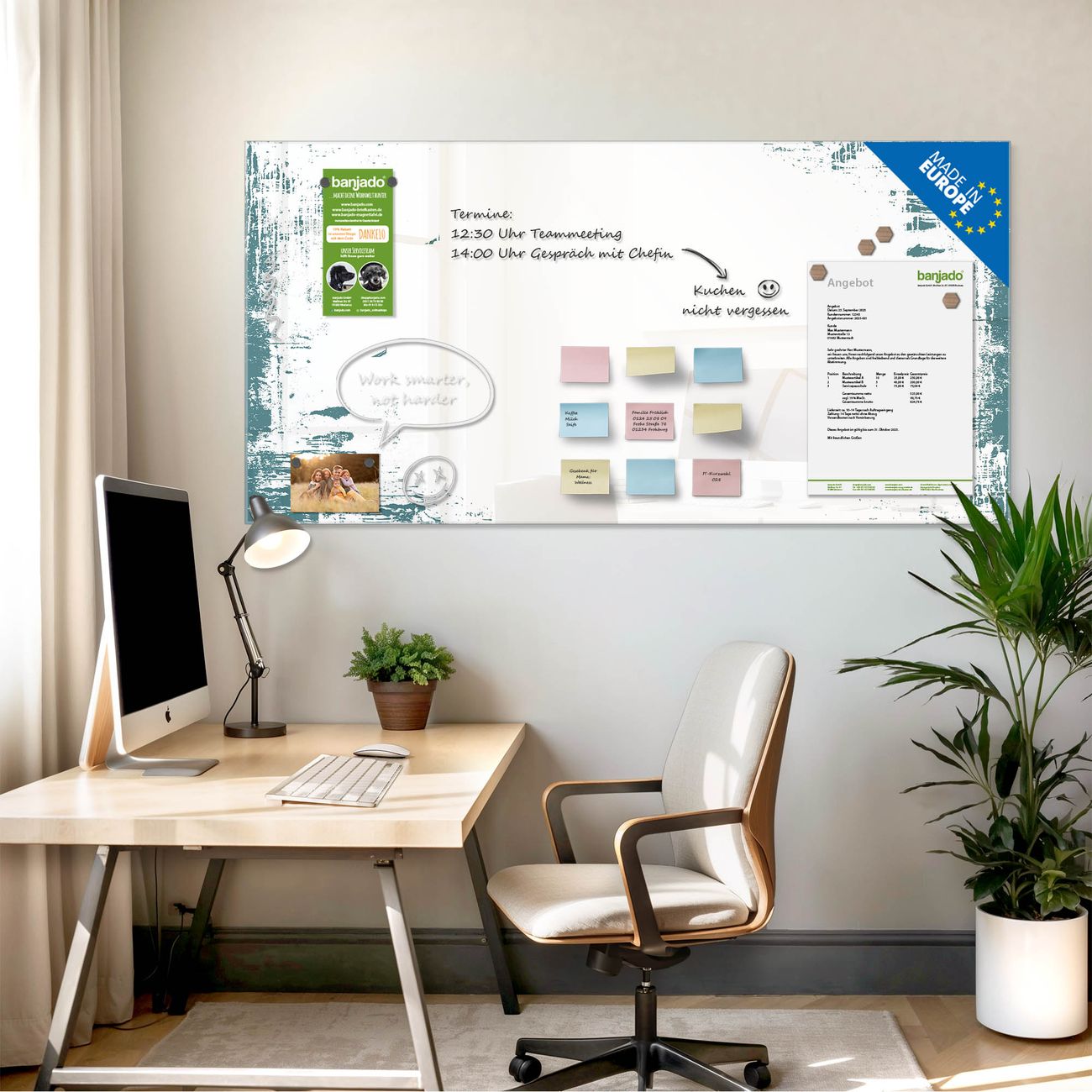 Jede Glas Magnettafel wird in unserer Werkstatt von Hand gefertigt und sorgfältig geprüft. So erhalten Sie ein echtes Qualitätsprodukt, das Funktion und Ästhetik perfekt vereint.?? Warum banjado?
