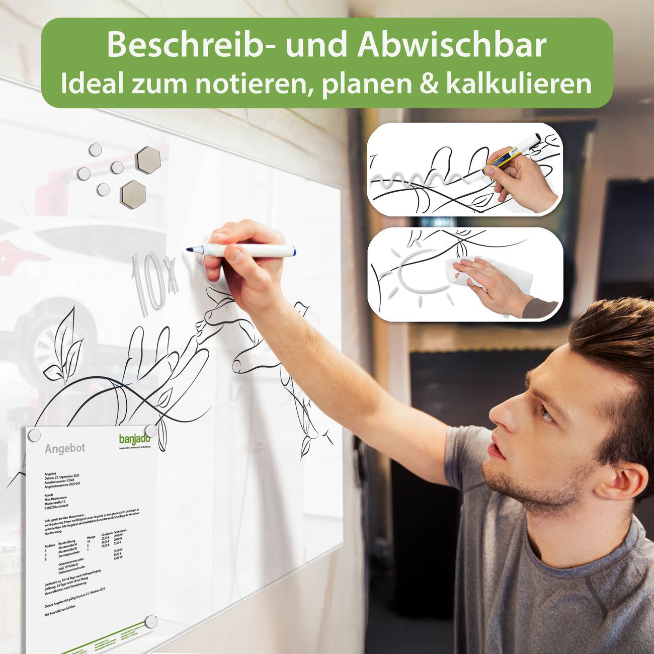 Jede Glas Magnettafel wird in unserer Werkstatt von Hand gefertigt und sorgfältig geprüft. So erhalten Sie ein echtes Qualitätsprodukt, das Funktion und Ästhetik perfekt vereint.?? Warum banjado?