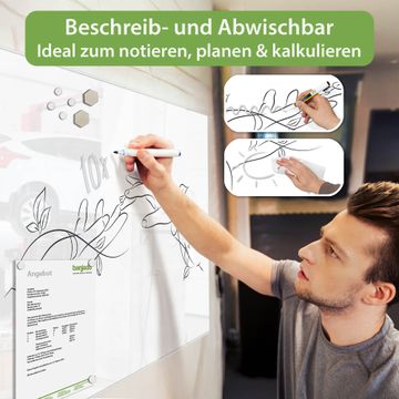 Auf der glatten Glasoberfläche lassen sich Termine, Rezepte oder Notizen ganz einfach mit Kreidestiften festhalten und rückstandslos entfernen. Starke Neodym-Magnete halten Ihre wichtigsten Erinnerungen sicher an Ort und Stelle. So entsteht Ihre ganz persönliche Ideenwand - jeden Tag neu.