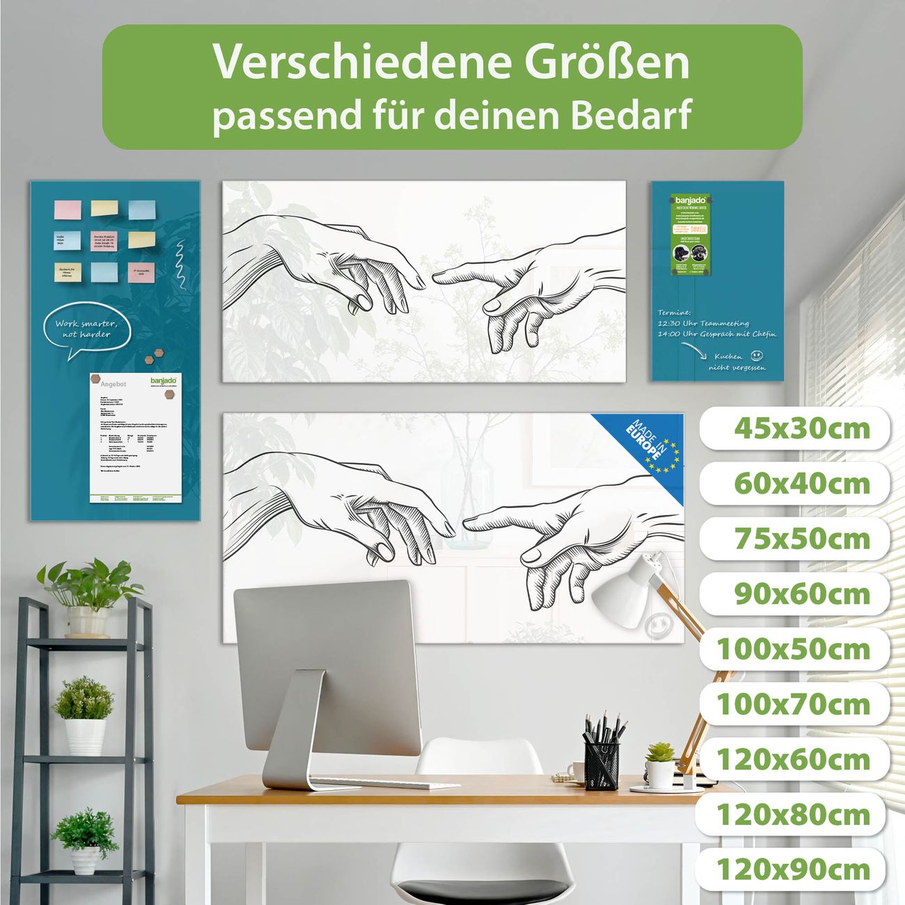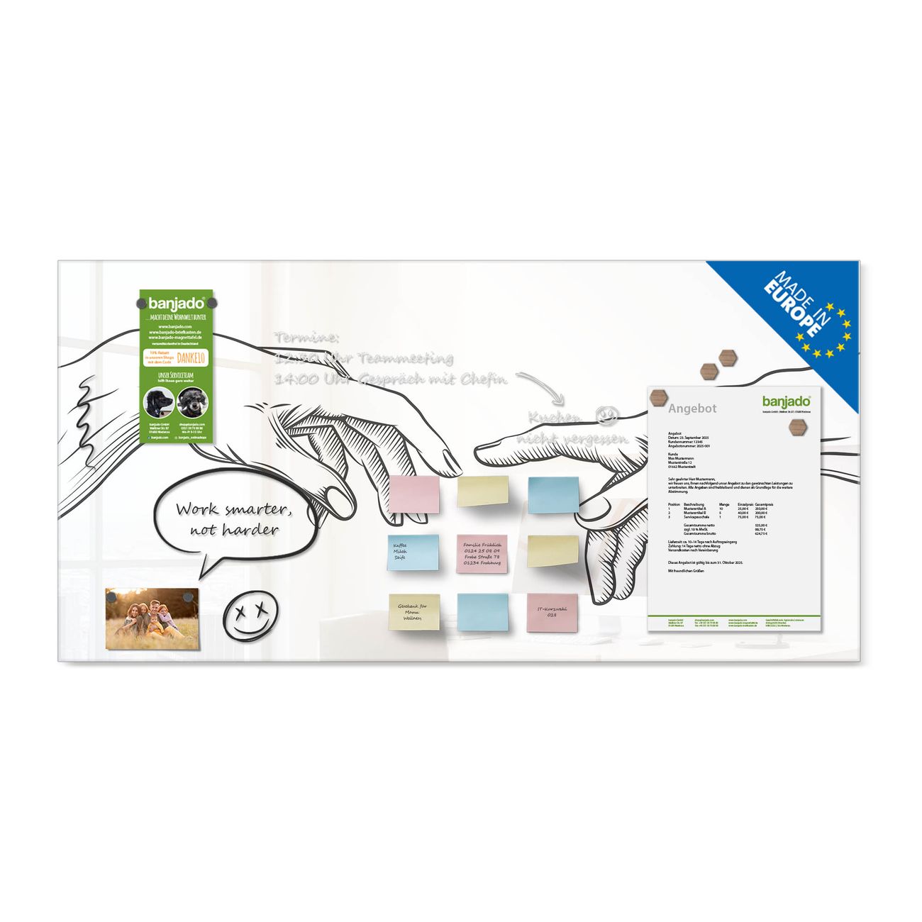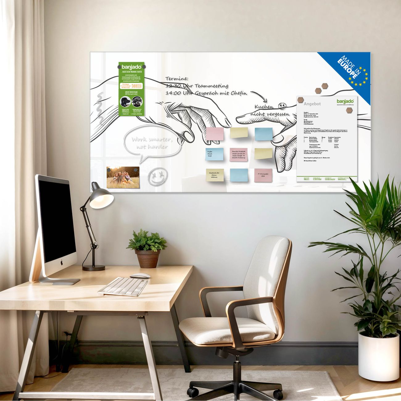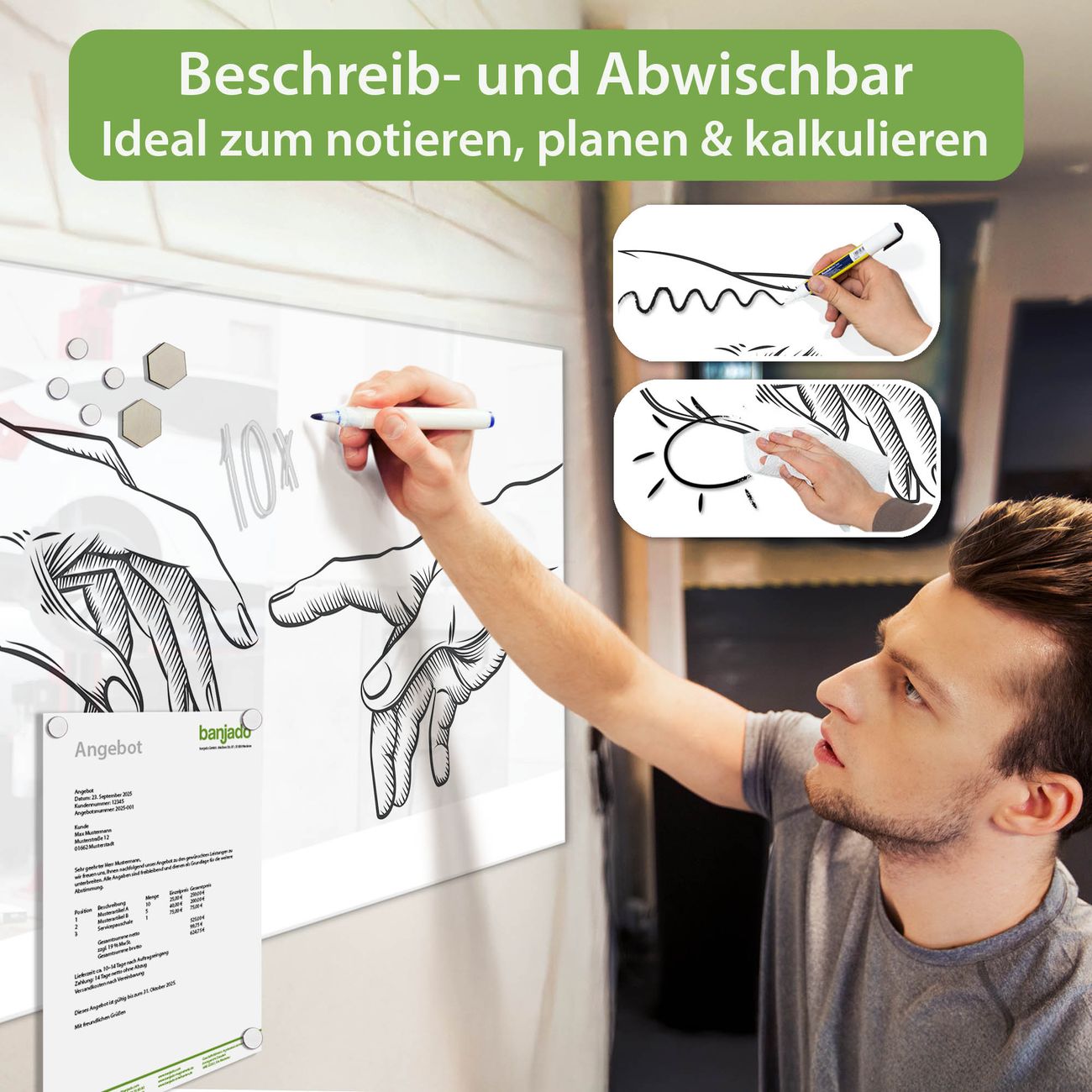 Jede Glas Magnettafel wird in unserer Werkstatt von Hand gefertigt und sorgfältig geprüft. So erhalten Sie ein echtes Qualitätsprodukt, das Funktion und Ästhetik perfekt vereint.?? Warum banjado?