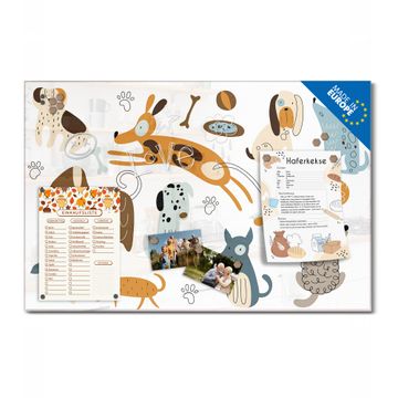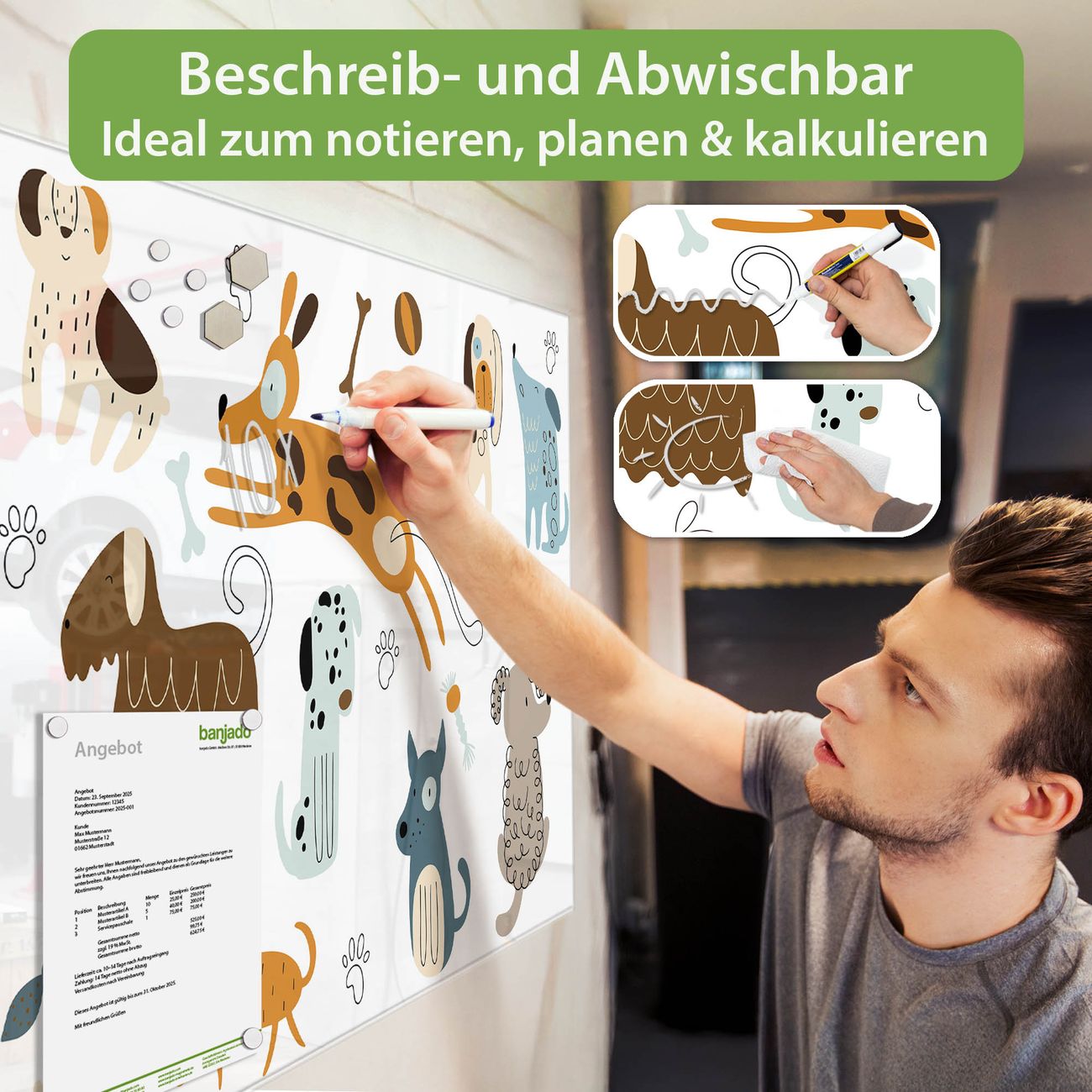 Ein Stück Design, das Ihren Alltag organisiert. Schreiben, heften, inspirieren - alles an einem Ort. Qualität, die man spürt. Montage leicht gemacht. Handwerk mit Herz - veredelt in Sachsen. Einzigartiges Design mit Motiv Motiv Verspielte Hunde-Illustration Beschreibbare Glasoberfläche, leicht zu reinigen Starke Magnetkraft durch Stahlrückwand Inklusive 4 Neodym-Magneten Flexible Montageoptionen Handveredelt in Sachsen - Qualität, die bleibt