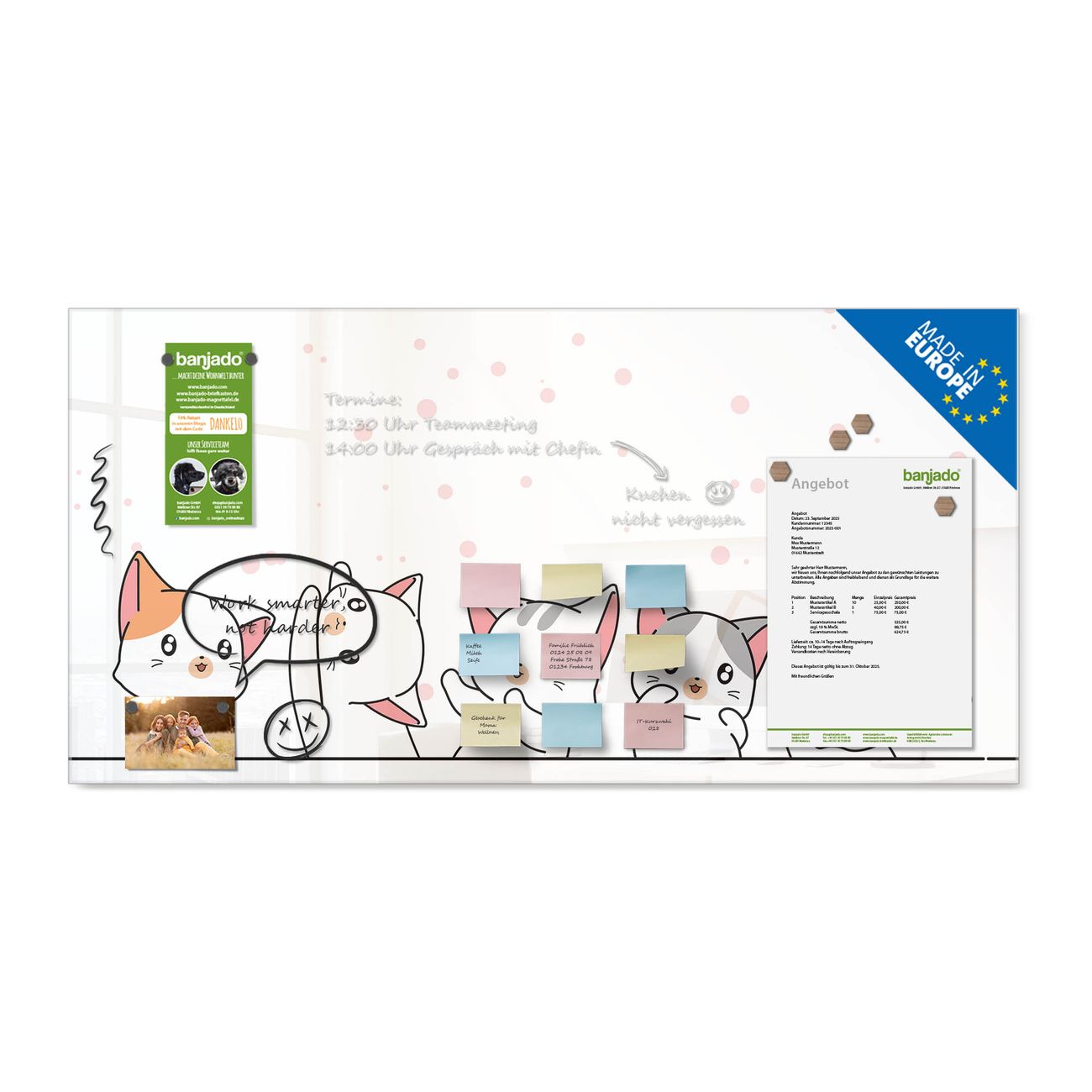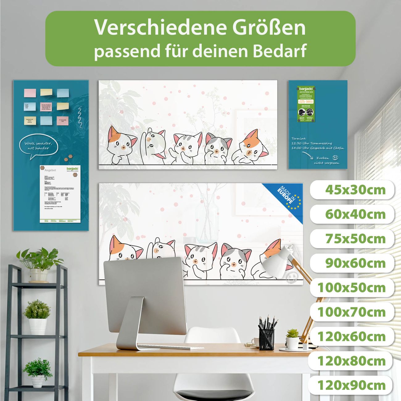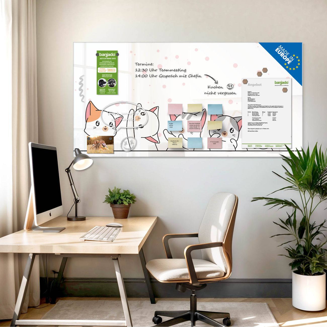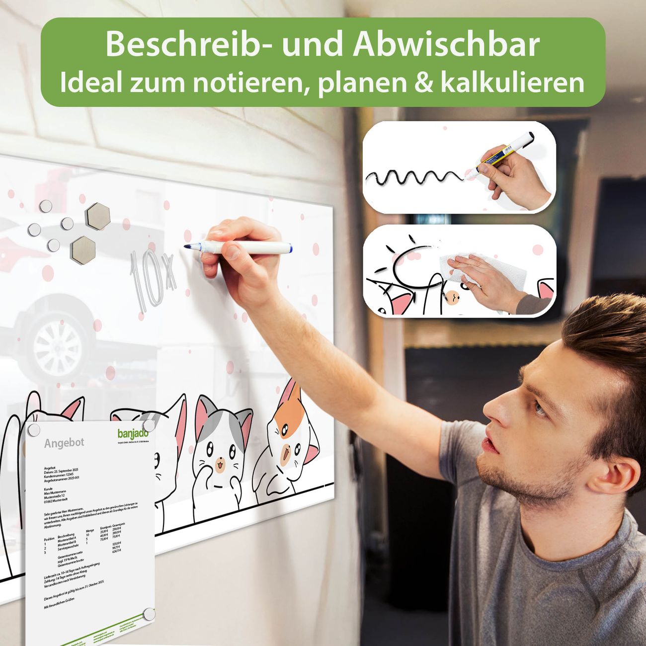 Jede Glas Magnettafel wird in unserer Werkstatt von Hand gefertigt und sorgfältig geprüft. So erhalten Sie ein echtes Qualitätsprodukt, das Funktion und Ästhetik perfekt vereint.?? Warum banjado?
