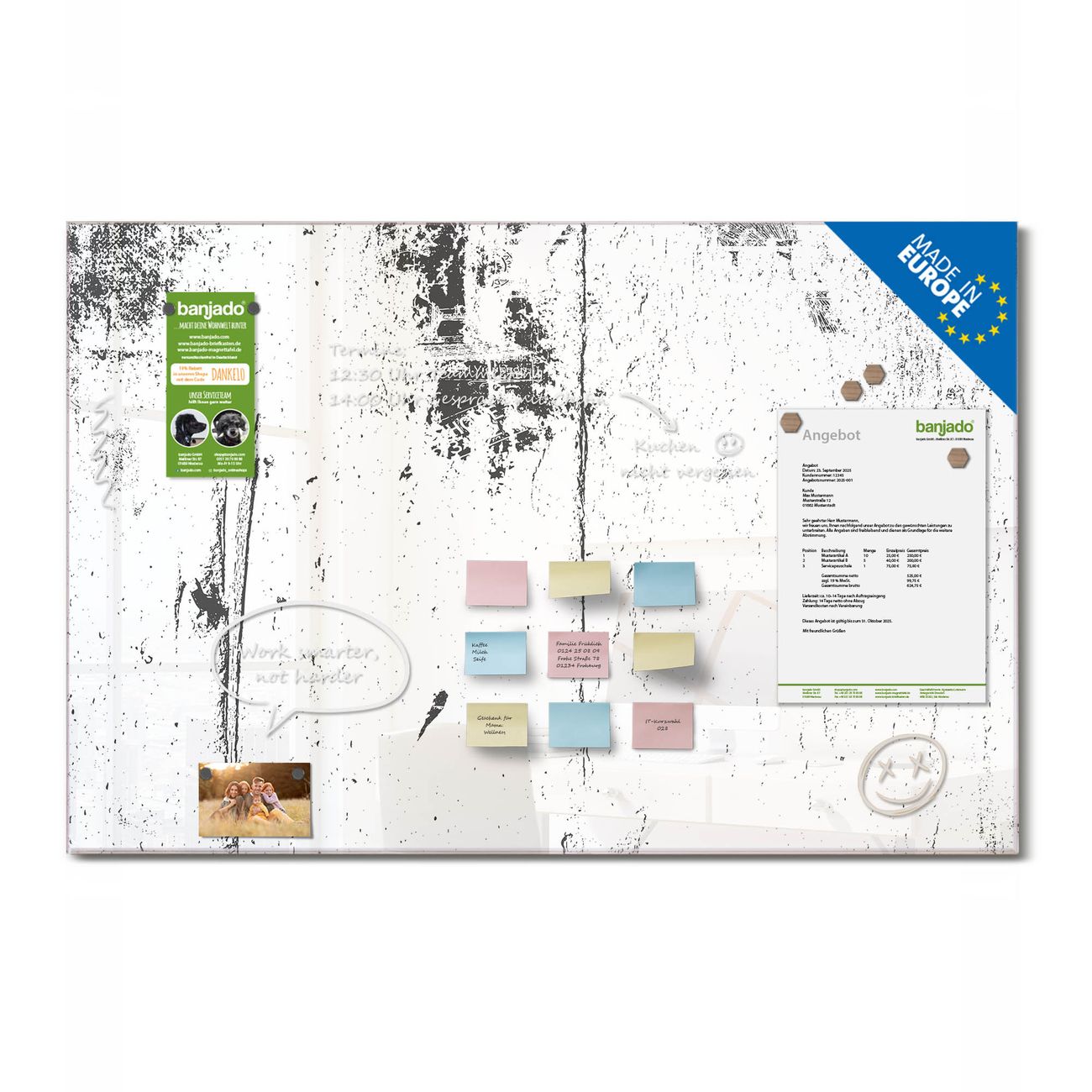 Jede Glas Magnettafel wird in unserer Werkstatt von Hand gefertigt und sorgfältig geprüft. So erhalten Sie ein echtes Qualitätsprodukt, das Funktion und Ästhetik perfekt vereint.?? Warum banjado?