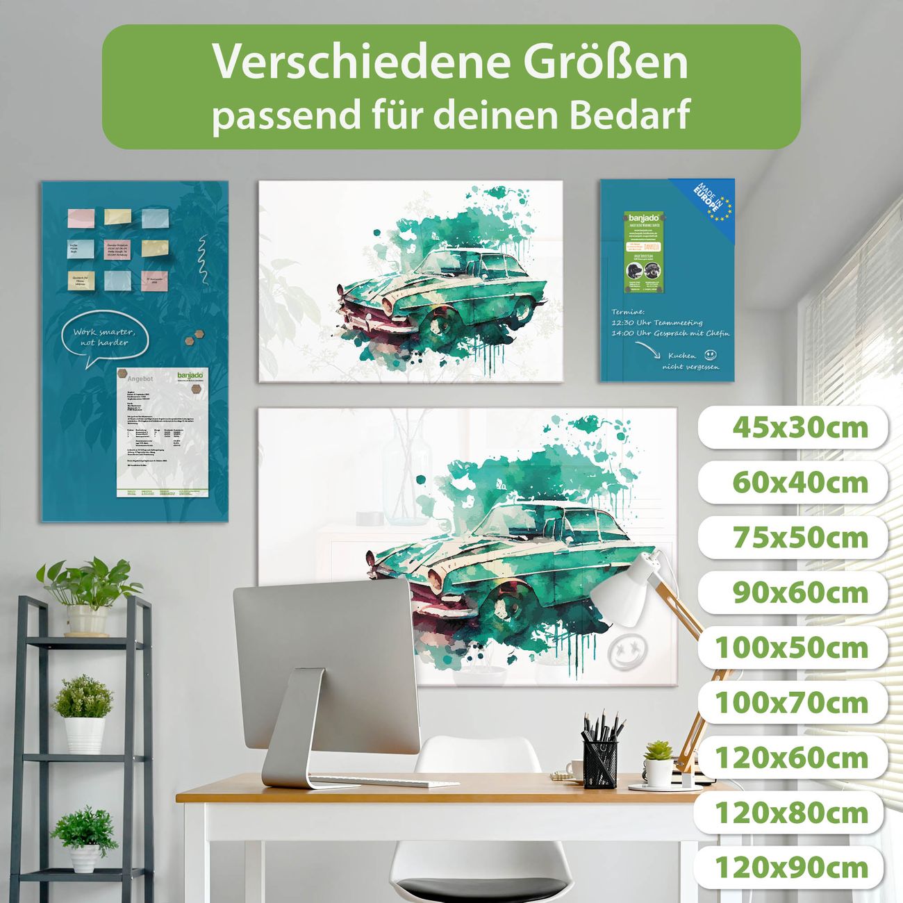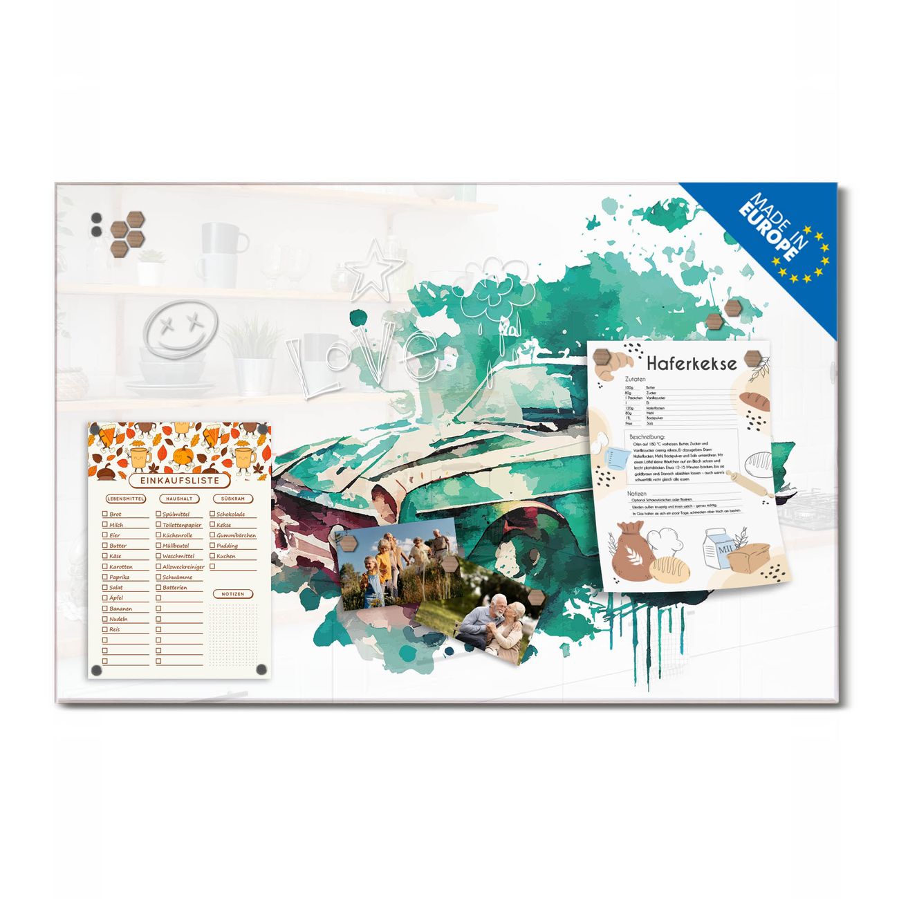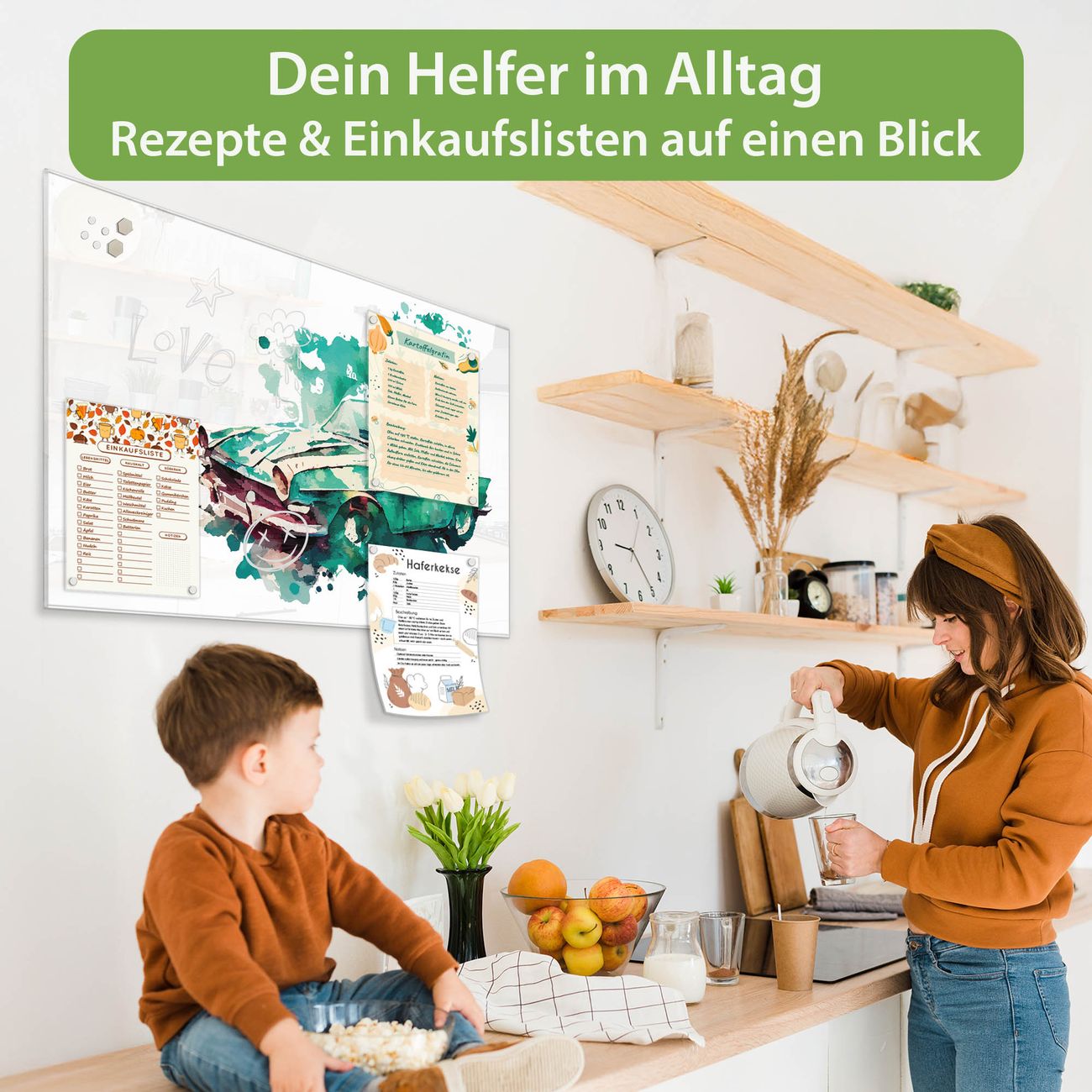 Ein Stück Design, das Ihren Alltag organisiert. Schreiben, heften, inspirieren - alles an einem Ort. Qualität, die man spürt. Montage leicht gemacht. Handwerk mit Herz - veredelt in Sachsen. Einzigartiges Design mit Motiv Motiv Vintage Auto Aquarell Beschreibbare Glasoberfläche, leicht zu reinigen Starke Magnetkraft durch Stahlrückwand Inklusive 4 Neodym-Magneten Flexible Montageoptionen Handveredelt in Sachsen - Qualität, die bleibt