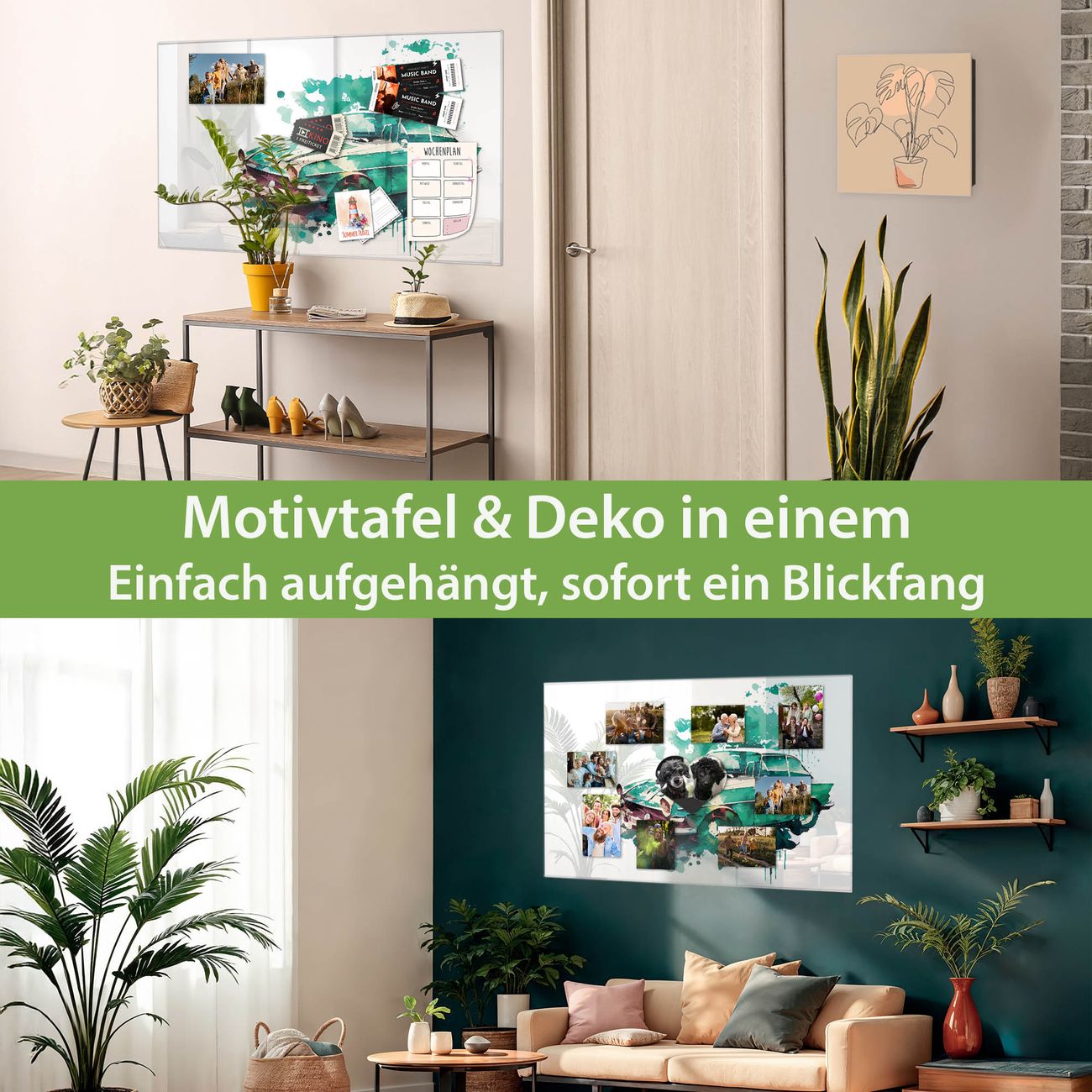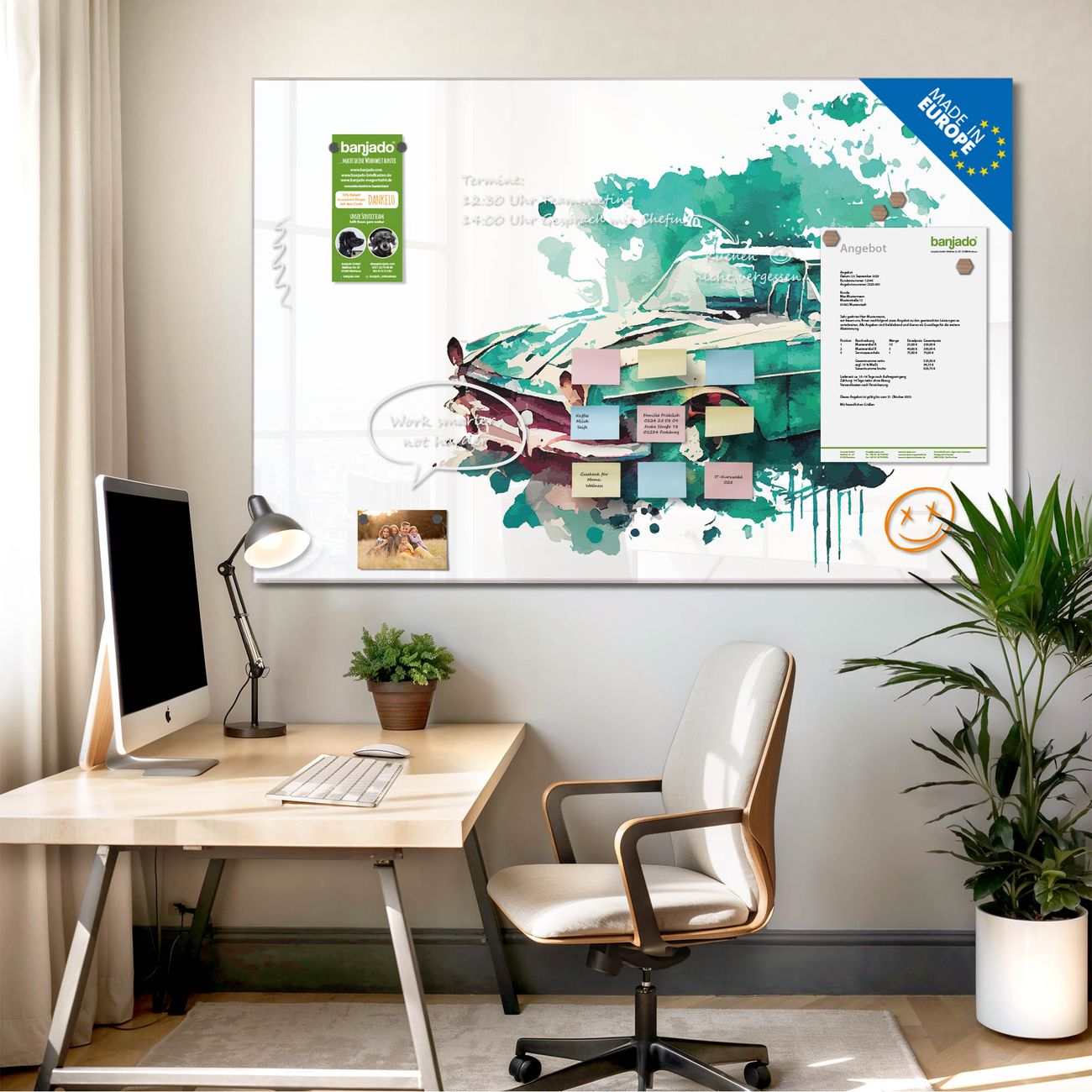 Die banjado Glas Magnettafel mit dem Motiv Motiv Vintage Auto Aquarell verbindet Funktionalität mit Stil. Sie ersetzt das Zettelchaos durch klare Strukturen und bringt dabei eine warme, natürliche Atmosphäre in Ihr Zuhause. Ob im Büro, in der Küche oder im Eingangsbereich - dieses Design-Board zieht Blicke an und sorgt für Ordnung mit Charakter.