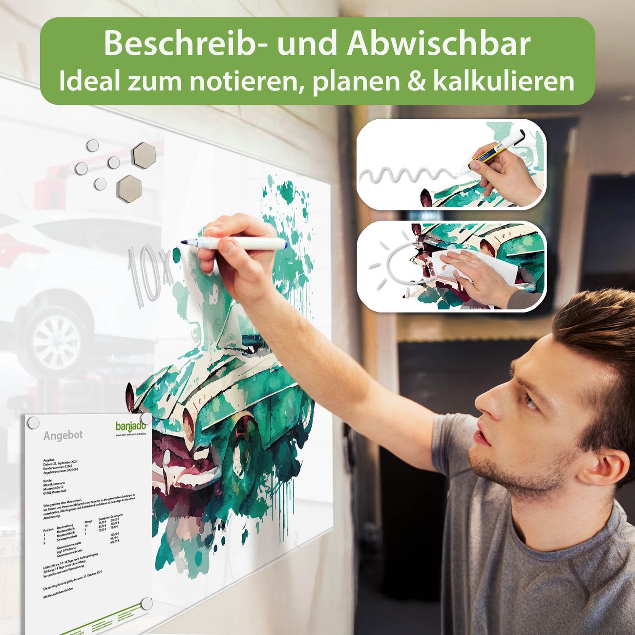 Jede Glas Magnettafel wird in unserer Werkstatt von Hand gefertigt und sorgfältig geprüft. So erhalten Sie ein echtes Qualitätsprodukt, das Funktion und Ästhetik perfekt vereint.?? Warum banjado?