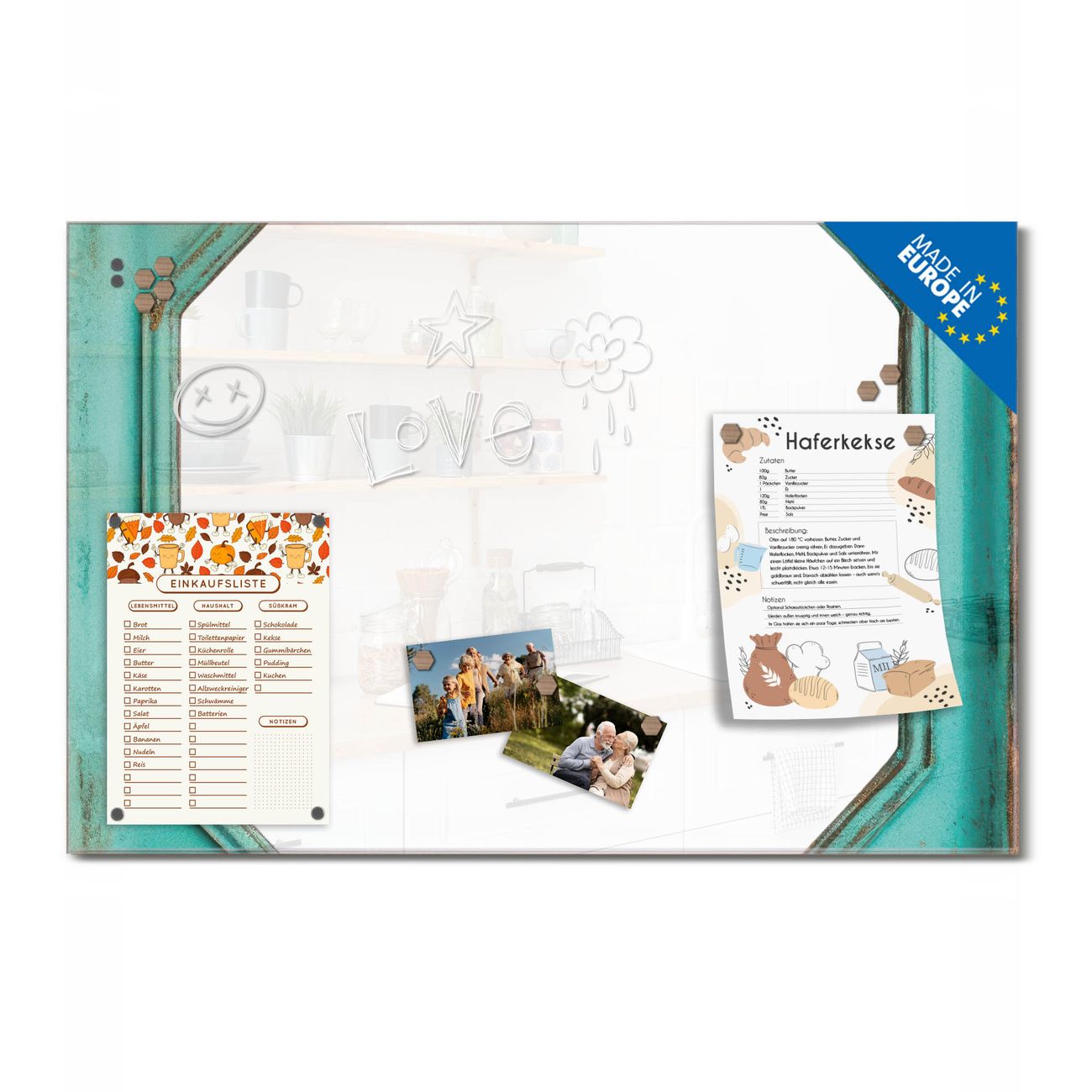 Ein Stück Design, das Ihren Alltag organisiert. Schreiben, heften, inspirieren - alles an einem Ort. Qualität, die man spürt. Montage leicht gemacht. Handwerk mit Herz - veredelt in Sachsen. Einzigartiges Design mit Motiv Motiv Vintage Metallrahmen Beschreibbare Glasoberfläche, leicht zu reinigen Starke Magnetkraft durch Stahlrückwand Inklusive 4 Neodym-Magneten Flexible Montageoptionen Handveredelt in Sachsen - Qualität, die bleibt