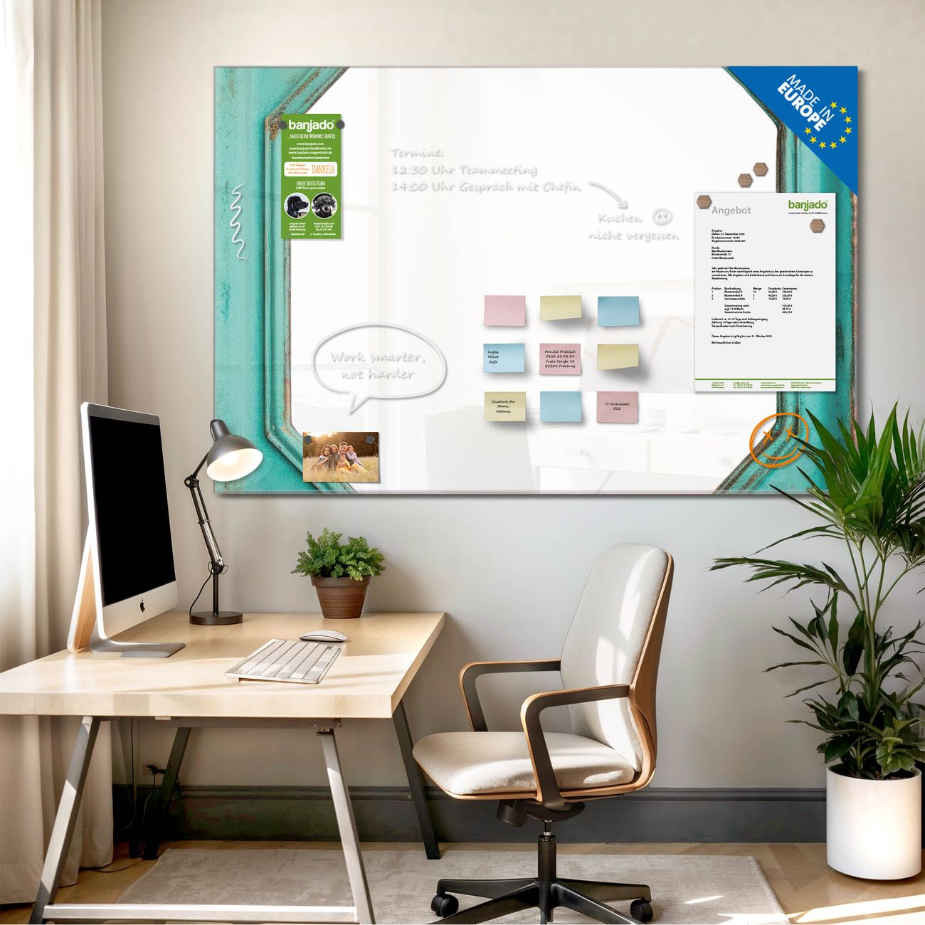 Jede Glas Magnettafel wird in unserer Werkstatt von Hand gefertigt und sorgfältig geprüft. So erhalten Sie ein echtes Qualitätsprodukt, das Funktion und Ästhetik perfekt vereint.?? Warum banjado?