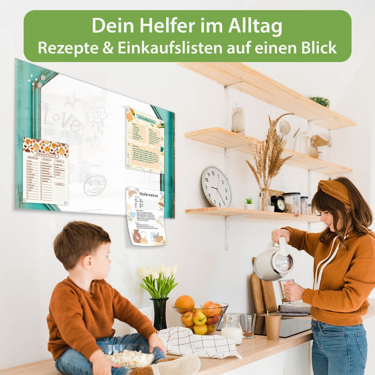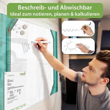 Auf der glatten Glasoberfläche lassen sich Termine, Rezepte oder Notizen ganz einfach mit Kreidestiften festhalten und rückstandslos entfernen. Starke Neodym-Magnete halten Ihre wichtigsten Erinnerungen sicher an Ort und Stelle. So entsteht Ihre ganz persönliche Ideenwand - jeden Tag neu.