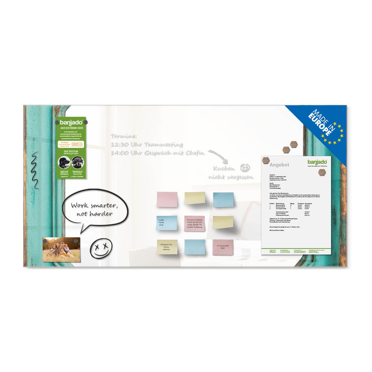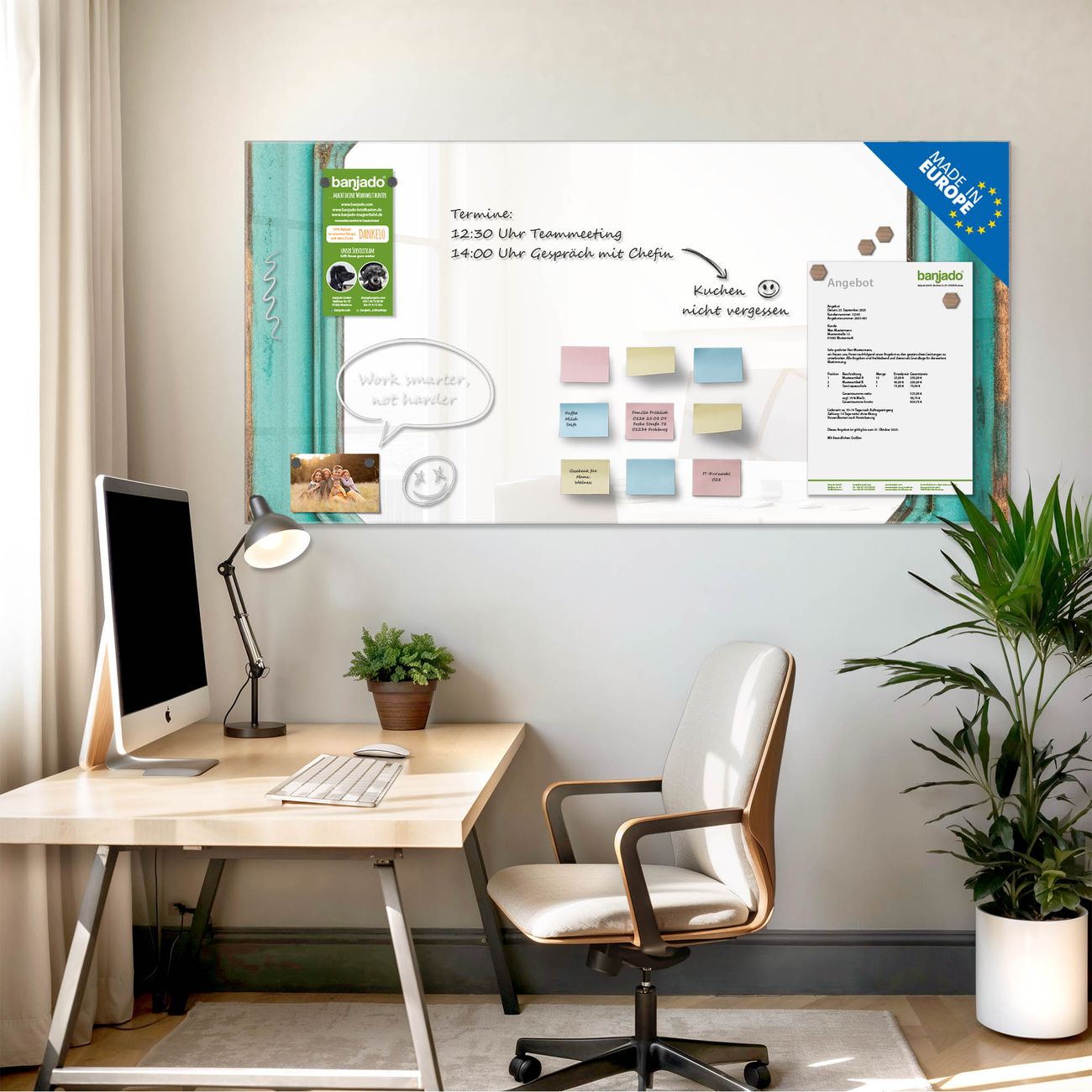 Jede Glas Magnettafel wird in unserer Werkstatt von Hand gefertigt und sorgfältig geprüft. So erhalten Sie ein echtes Qualitätsprodukt, das Funktion und Ästhetik perfekt vereint.?? Warum banjado?