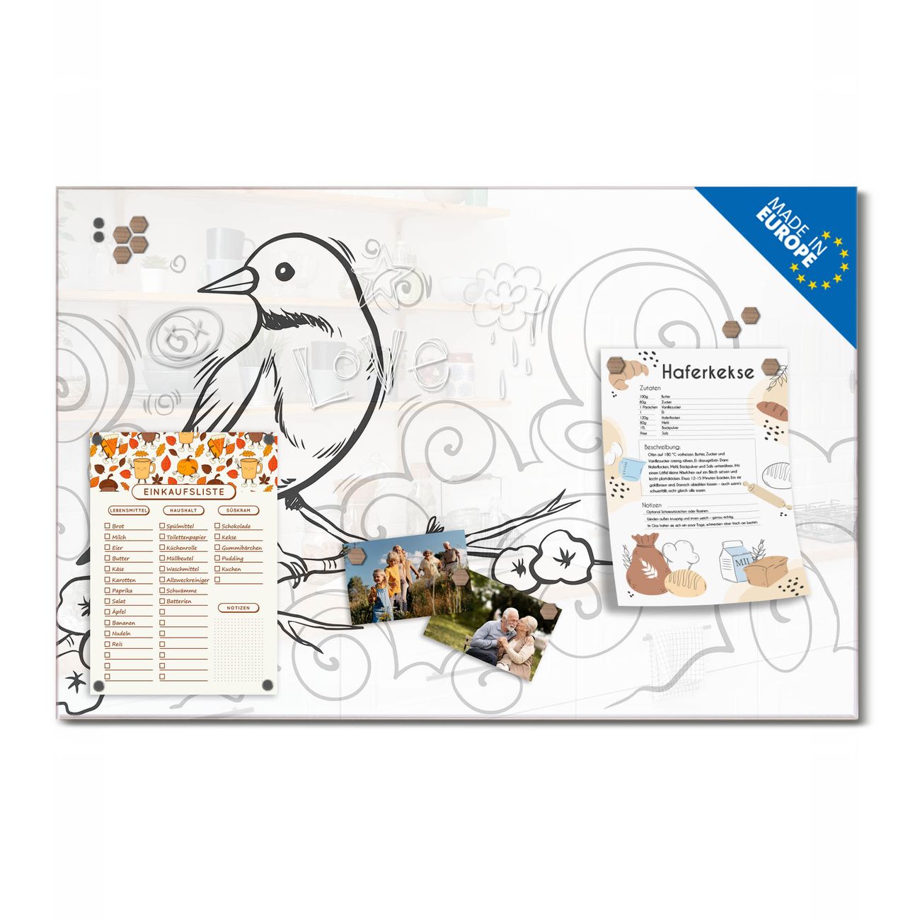Ein Stück Design, das Ihren Alltag organisiert. Schreiben, heften, inspirieren - alles an einem Ort. Qualität, die man spürt. Montage leicht gemacht. Handwerk mit Herz - veredelt in Sachsen. Einzigartiges Design mit Motiv Motiv Vogel auf Blütenzweig Beschreibbare Glasoberfläche, leicht zu reinigen Starke Magnetkraft durch Stahlrückwand Inklusive 4 Neodym-Magneten Flexible Montageoptionen Handveredelt in Sachsen - Qualität, die bleibt