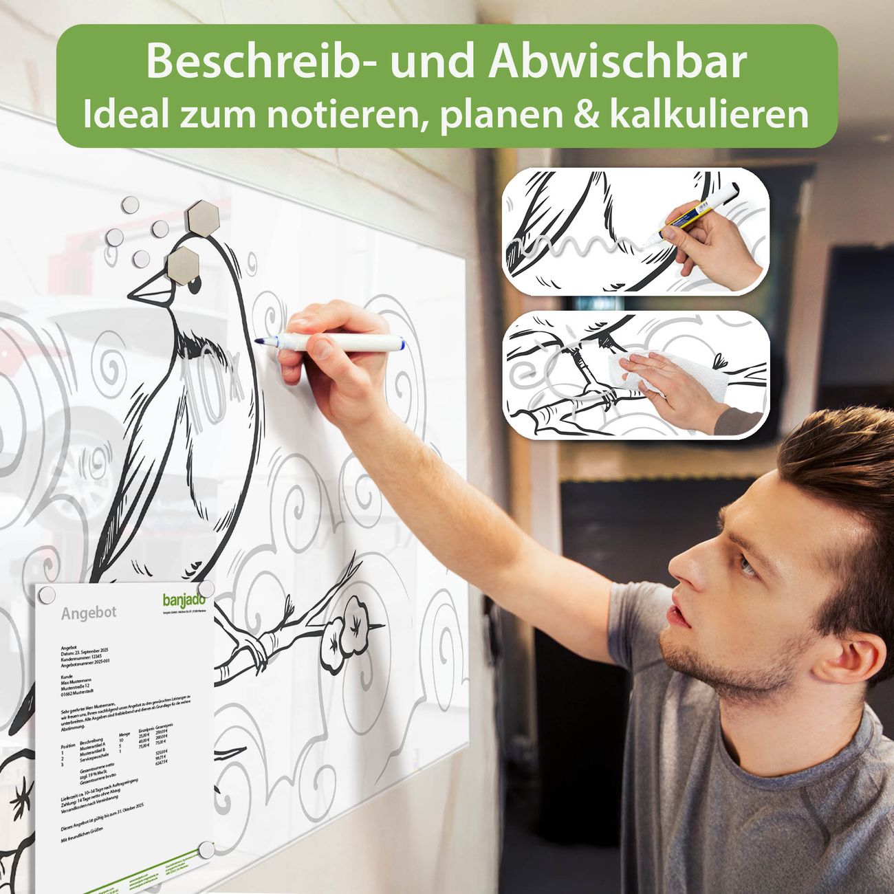 Jede Glas Magnettafel wird in unserer Werkstatt von Hand gefertigt und sorgfältig geprüft. So erhalten Sie ein echtes Qualitätsprodukt, das Funktion und Ästhetik perfekt vereint.?? Warum banjado?