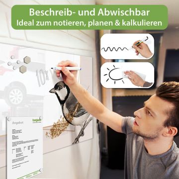 Auf der glatten Glasoberfläche lassen sich Termine, Rezepte oder Notizen ganz einfach mit Kreidestiften festhalten und rückstandslos entfernen. Starke Neodym-Magnete halten Ihre wichtigsten Erinnerungen sicher an Ort und Stelle. So entsteht Ihre ganz persönliche Ideenwand - jeden Tag neu.