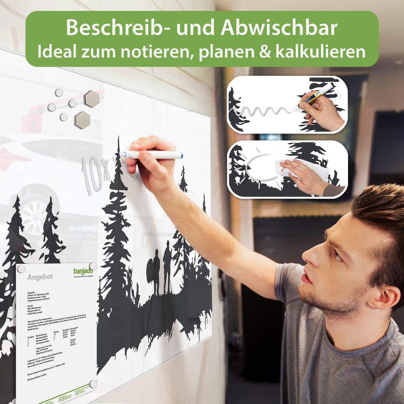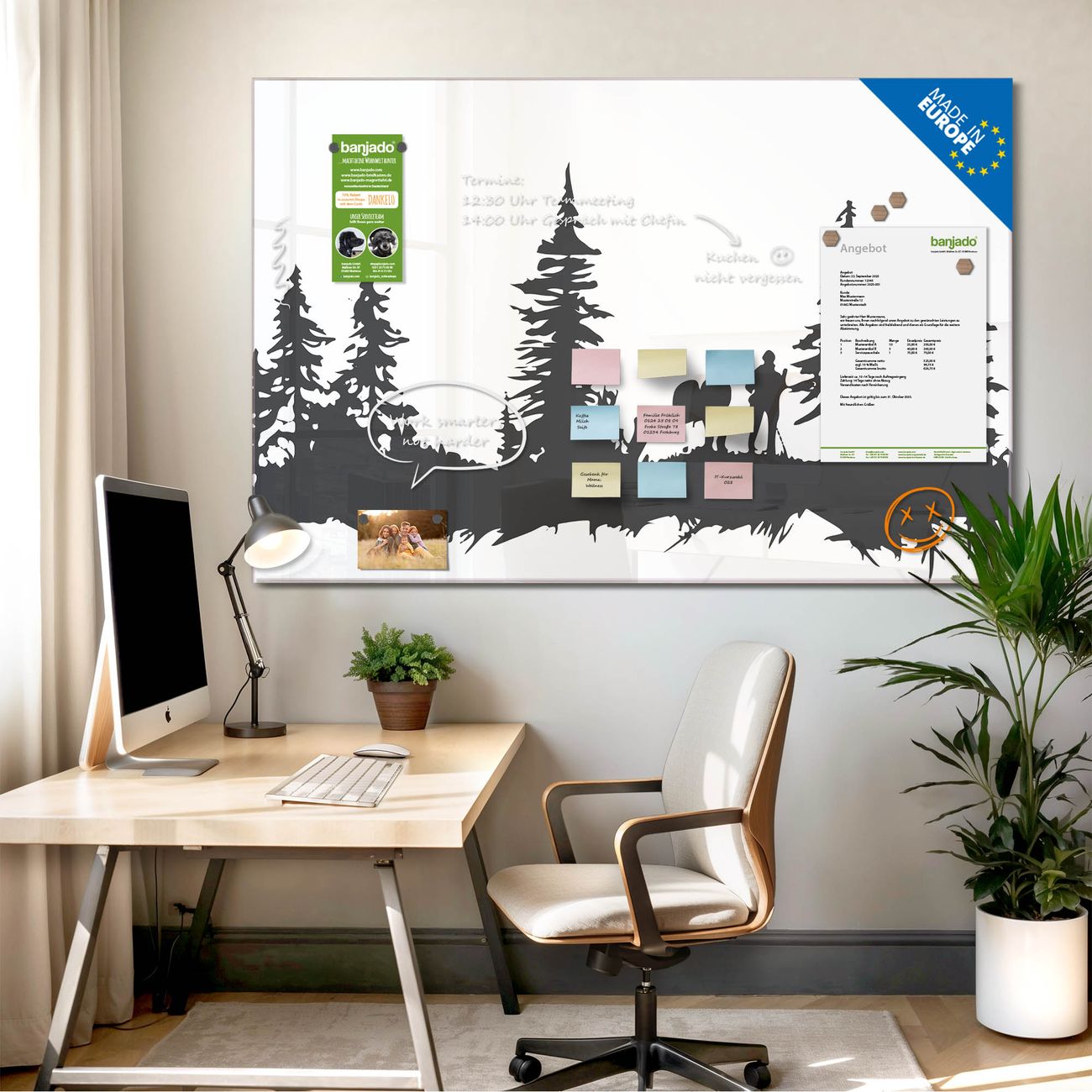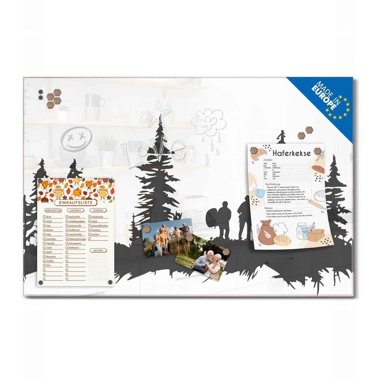 Ein Stück Design, das Ihren Alltag organisiert. Schreiben, heften, inspirieren - alles an einem Ort. Qualität, die man spürt. Montage leicht gemacht. Handwerk mit Herz - veredelt in Sachsen. Einzigartiges Design mit Motiv Motiv Waldabenteuer Silhouette Beschreibbare Glasoberfläche, leicht zu reinigen Starke Magnetkraft durch Stahlrückwand Inklusive 4 Neodym-Magneten Flexible Montageoptionen Handveredelt in Sachsen - Qualität, die bleibt
