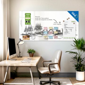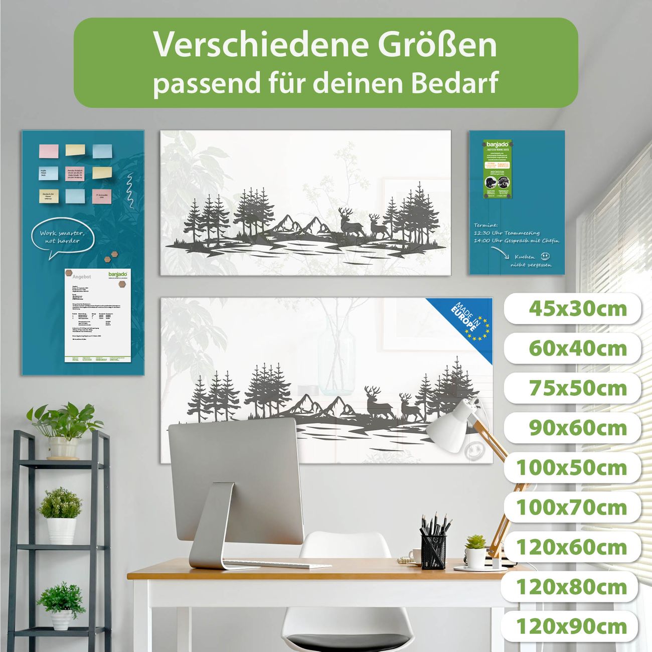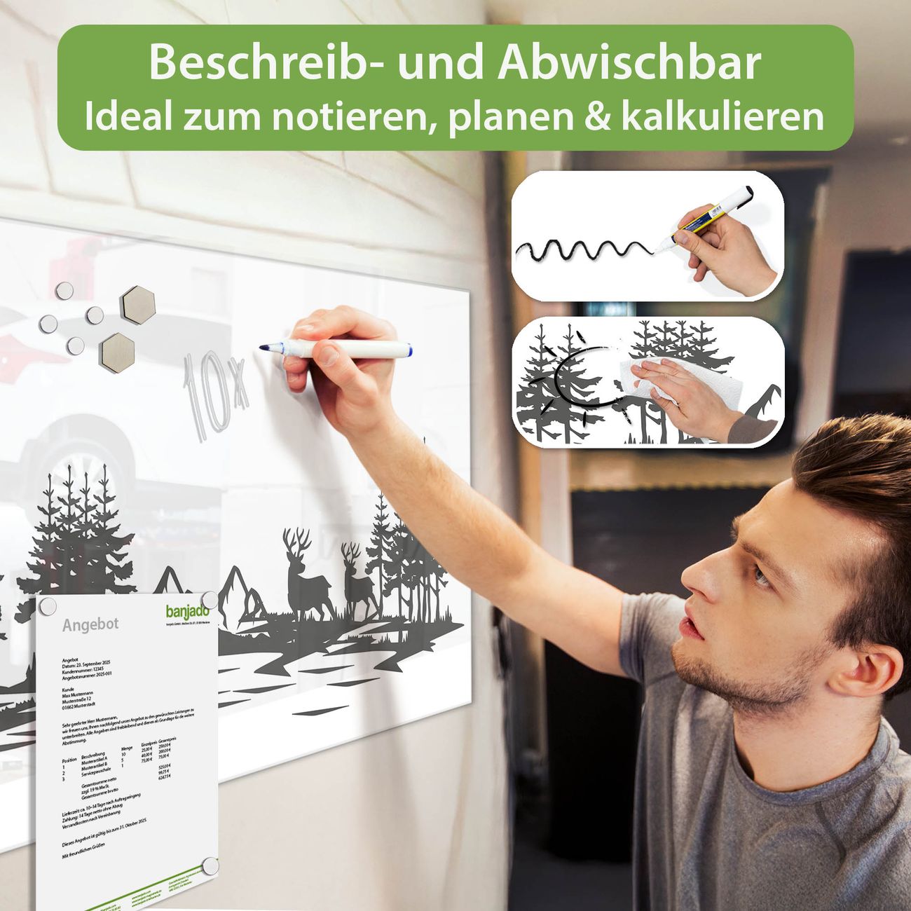 Ein Stück Design, das Ihren Alltag organisiert. Schreiben, heften, inspirieren - alles an einem Ort. Qualität, die man spürt. Montage leicht gemacht. Handwerk mit Herz - veredelt in Sachsen. Einzigartiges Design mit Motiv Motiv Waldidylle mit Hirschen Beschreibbare Glasoberfläche, leicht zu reinigen Starke Magnetkraft durch Stahlrückwand Inklusive 4 Neodym-Magneten Flexible Montageoptionen Handveredelt in Sachsen - Qualität, die bleibt