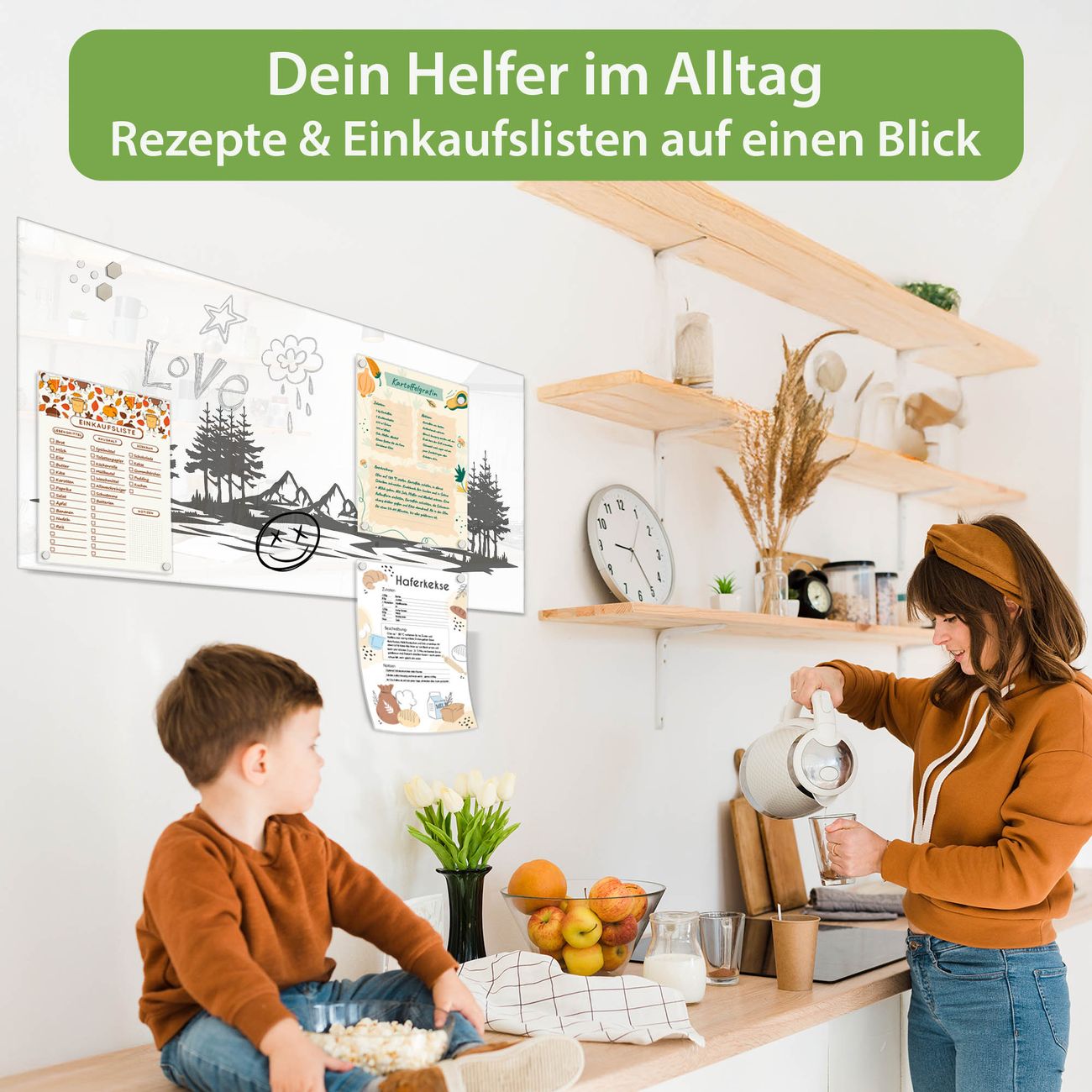 Auf der glatten Glasoberfläche lassen sich Termine, Rezepte oder Notizen ganz einfach mit Kreidestiften festhalten und rückstandslos entfernen. Starke Neodym-Magnete halten Ihre wichtigsten Erinnerungen sicher an Ort und Stelle. So entsteht Ihre ganz persönliche Ideenwand - jeden Tag neu.