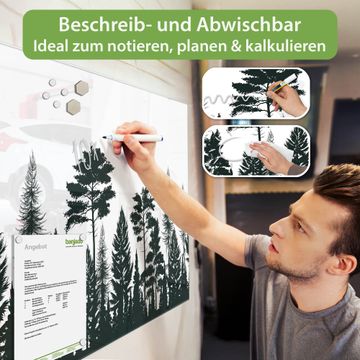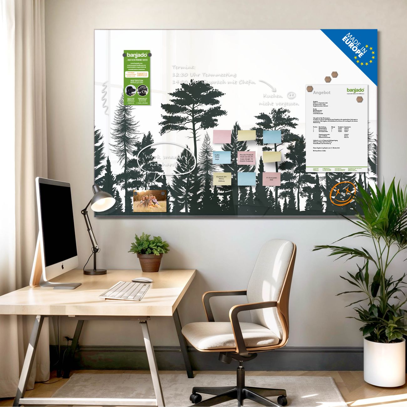 Die banjado Glas Magnettafel mit dem Motiv Motiv Waldsilhouette verbindet Funktionalität mit Stil. Sie ersetzt das Zettelchaos durch klare Strukturen und bringt dabei eine warme, natürliche Atmosphäre in Ihr Zuhause. Ob im Büro, in der Küche oder im Eingangsbereich - dieses Design-Board zieht Blicke an und sorgt für Ordnung mit Charakter.