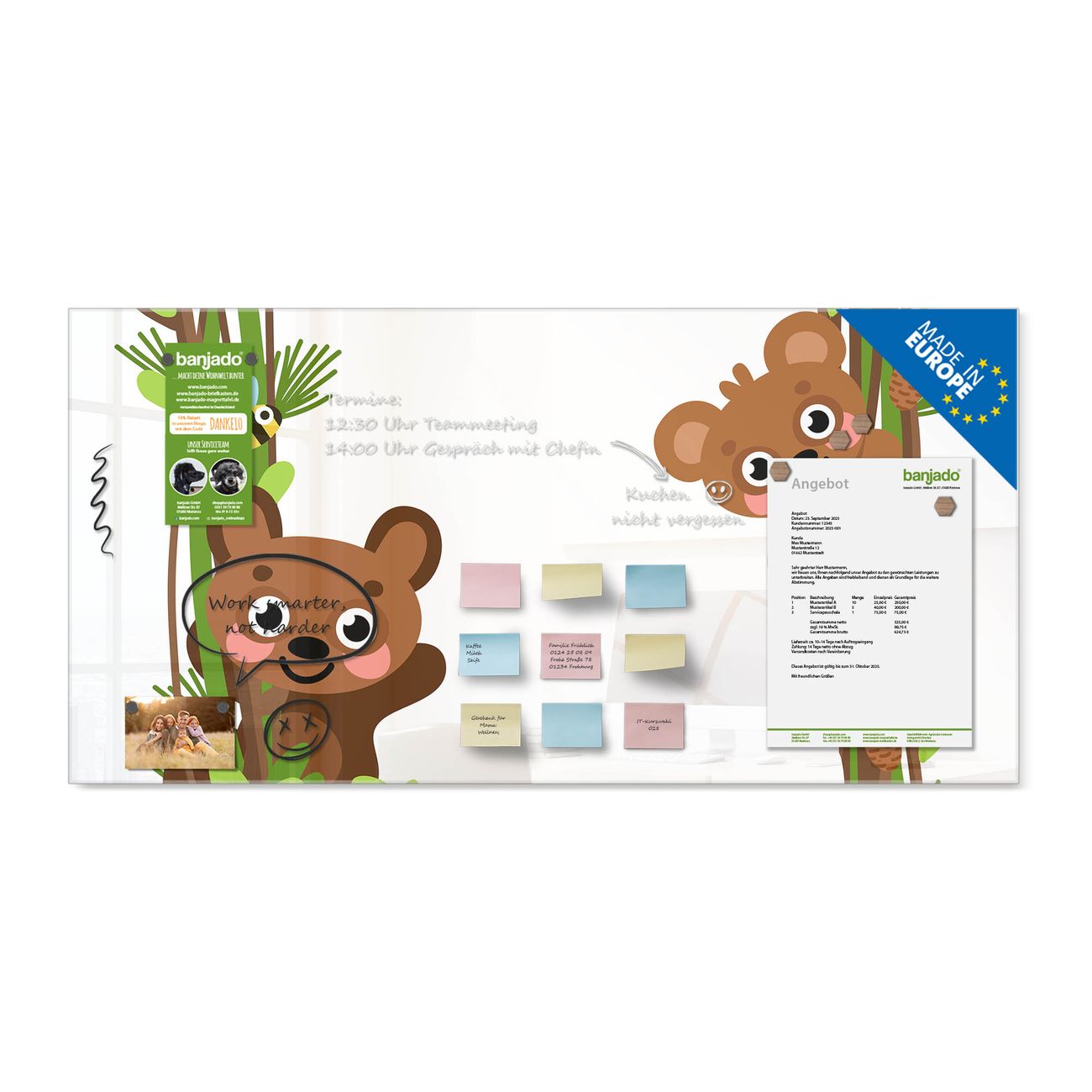 Jede Glas Magnettafel wird in unserer Werkstatt von Hand gefertigt und sorgfältig geprüft. So erhalten Sie ein echtes Qualitätsprodukt, das Funktion und Ästhetik perfekt vereint.?? Warum banjado?