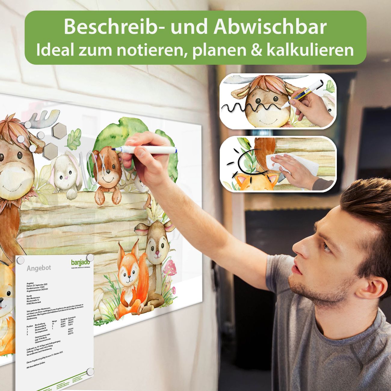 Die banjado Glas Magnettafel mit dem Motiv Motiv Waldtiere Abenteuer verbindet Funktionalität mit Stil. Sie ersetzt das Zettelchaos durch klare Strukturen und bringt dabei eine warme, natürliche Atmosphäre in Ihr Zuhause. Ob im Büro, in der Küche oder im Eingangsbereich - dieses Design-Board zieht Blicke an und sorgt für Ordnung mit Charakter.