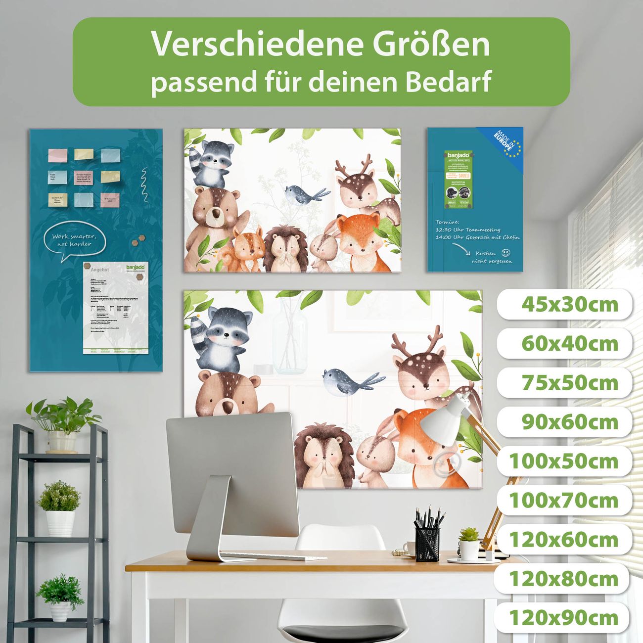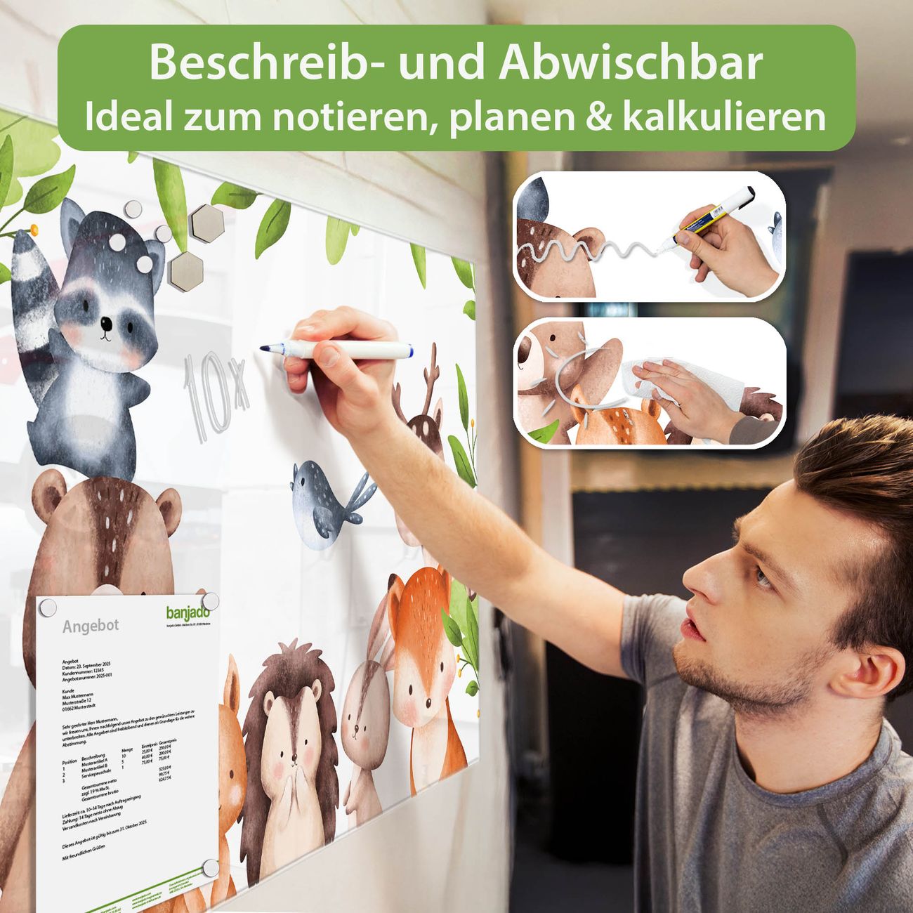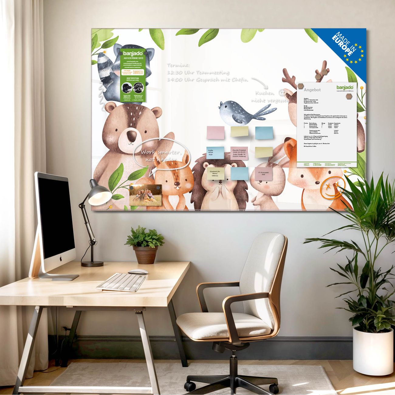 Die banjado Glas Magnettafel mit dem Motiv Motiv Waldtierfreunde 2 verbindet Funktionalität mit Stil. Sie ersetzt das Zettelchaos durch klare Strukturen und bringt dabei eine warme, natürliche Atmosphäre in Ihr Zuhause. Ob im Büro, in der Küche oder im Eingangsbereich - dieses Design-Board zieht Blicke an und sorgt für Ordnung mit Charakter.