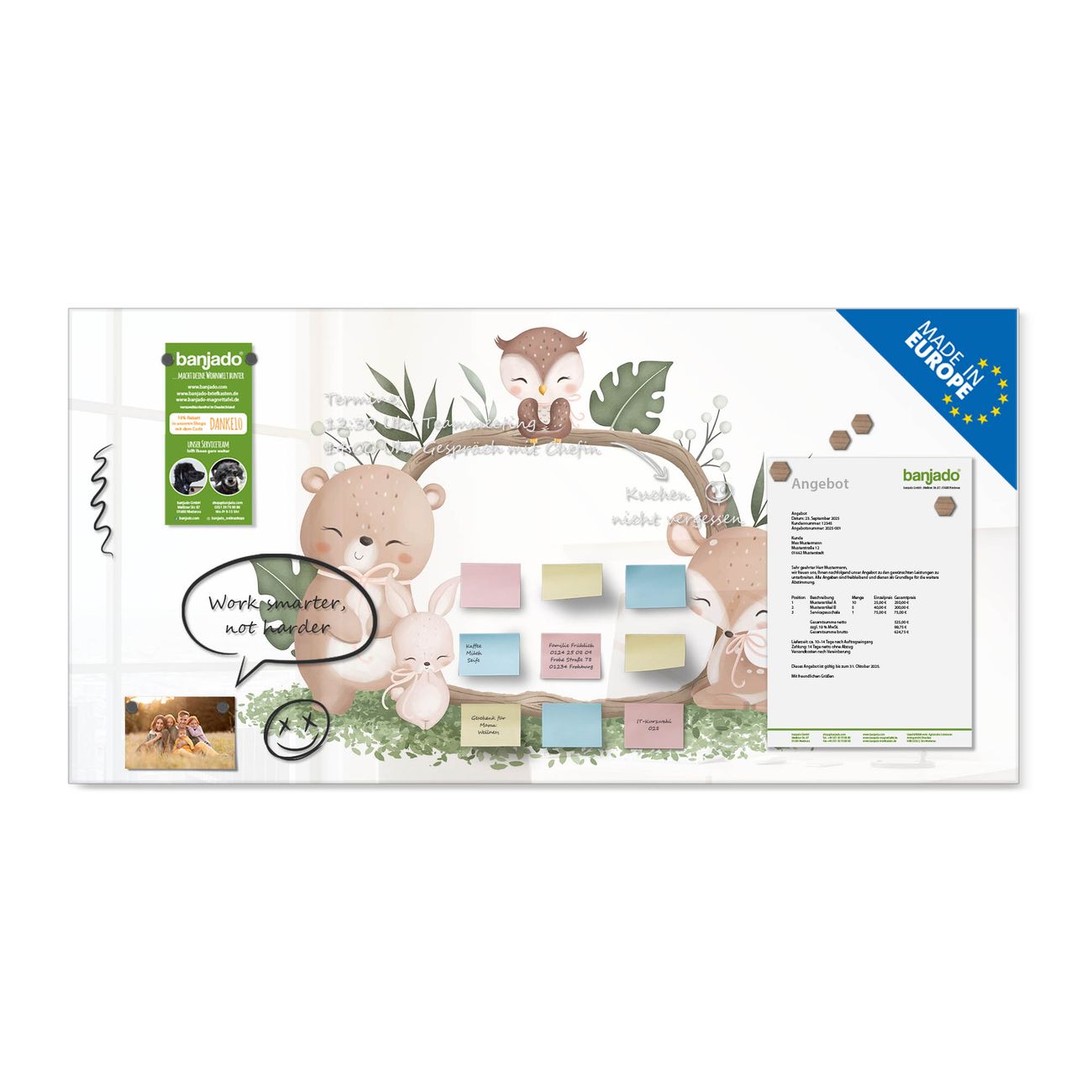 Jede Glas Magnettafel wird in unserer Werkstatt von Hand gefertigt und sorgfältig geprüft. So erhalten Sie ein echtes Qualitätsprodukt, das Funktion und Ästhetik perfekt vereint.?? Warum banjado?