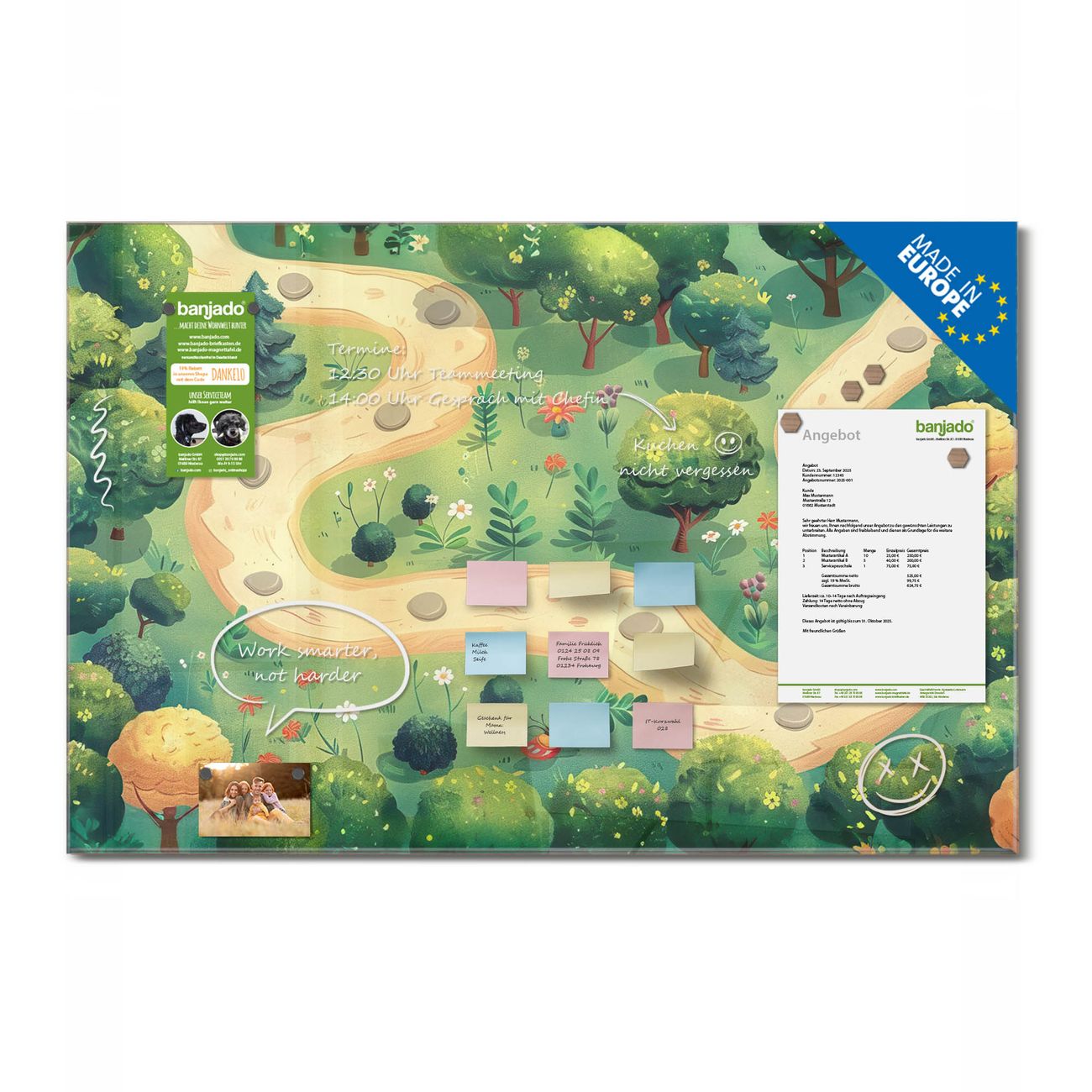 Jede Glas Magnettafel wird in unserer Werkstatt von Hand gefertigt und sorgfältig geprüft. So erhalten Sie ein echtes Qualitätsprodukt, das Funktion und Ästhetik perfekt vereint.?? Warum banjado?