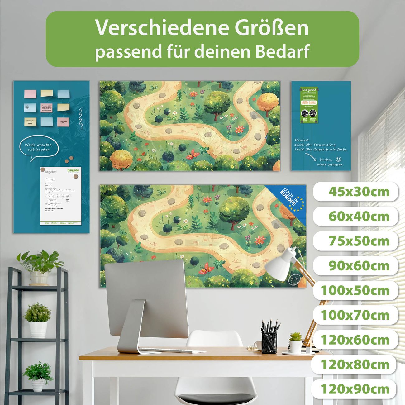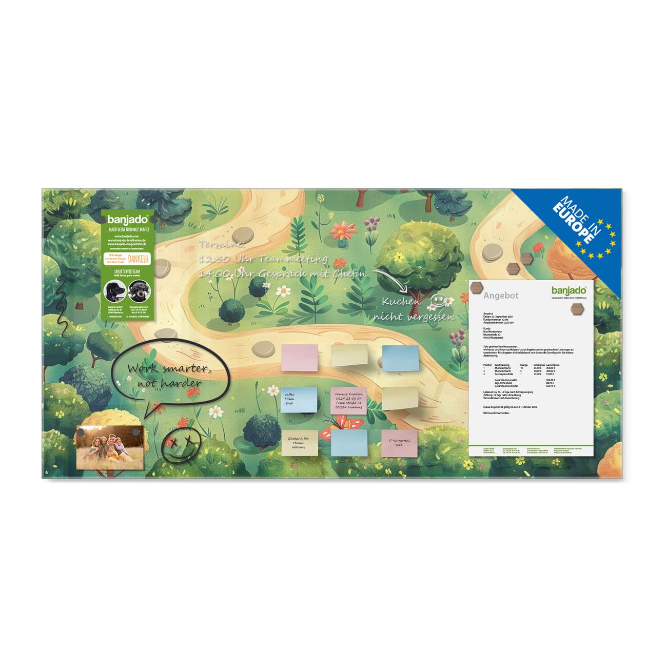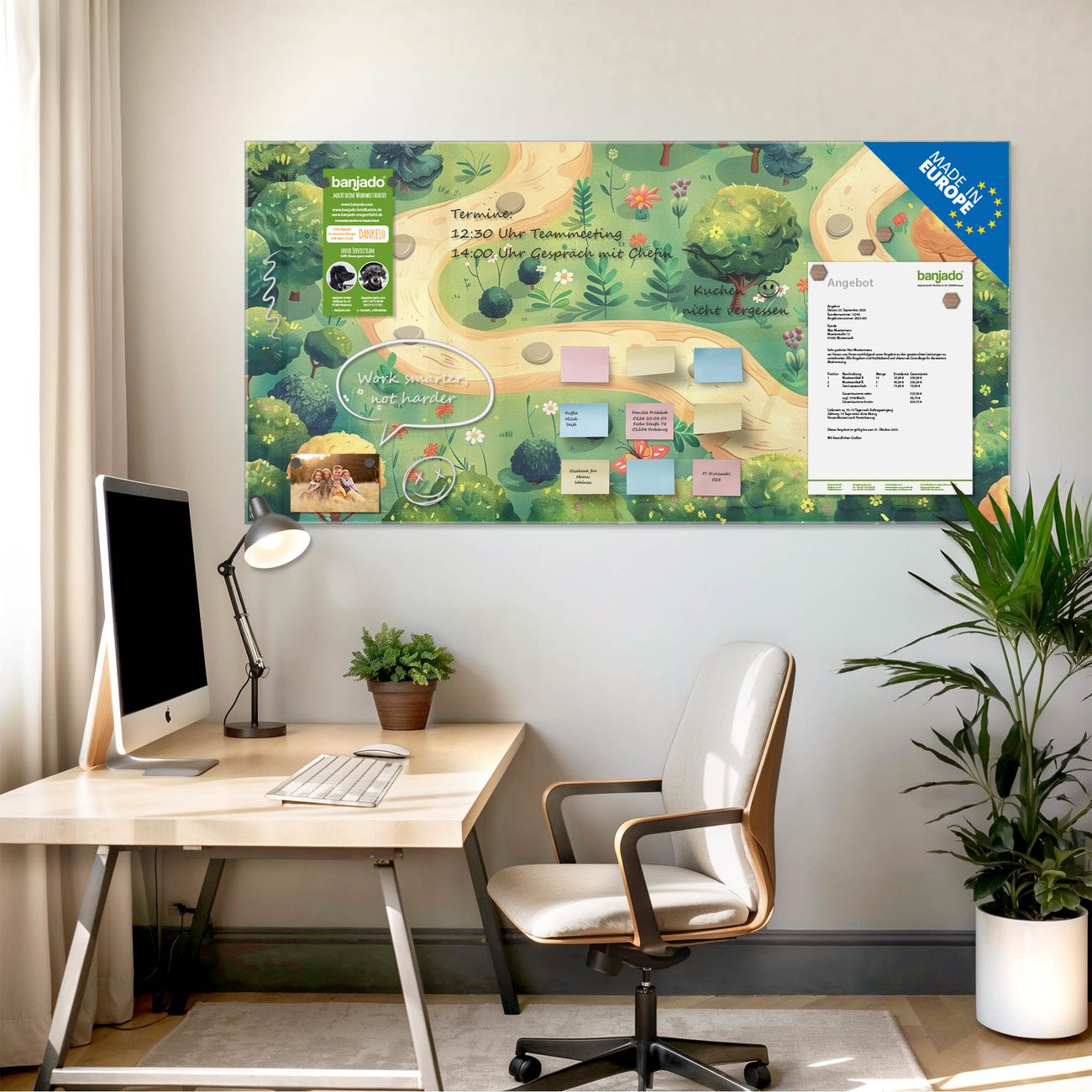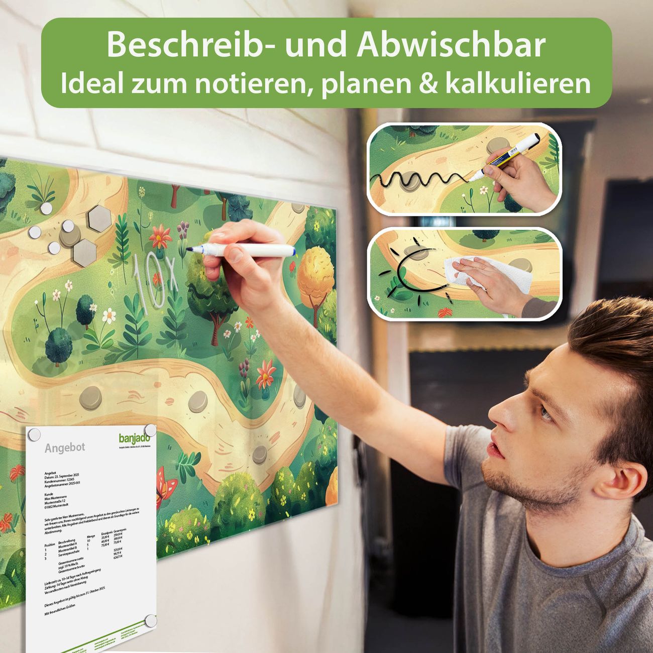 Jede Glas Magnettafel wird in unserer Werkstatt von Hand gefertigt und sorgfältig geprüft. So erhalten Sie ein echtes Qualitätsprodukt, das Funktion und Ästhetik perfekt vereint.?? Warum banjado?