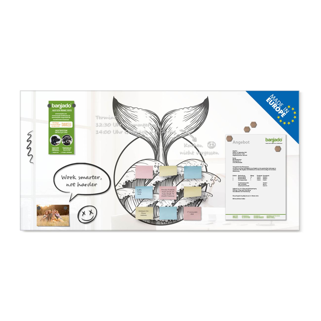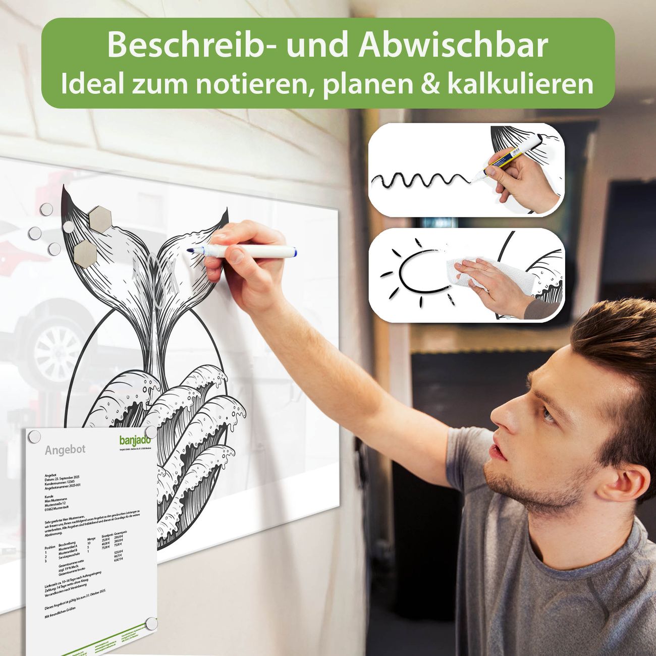 Jede Glas Magnettafel wird in unserer Werkstatt von Hand gefertigt und sorgfältig geprüft. So erhalten Sie ein echtes Qualitätsprodukt, das Funktion und Ästhetik perfekt vereint.?? Warum banjado?
