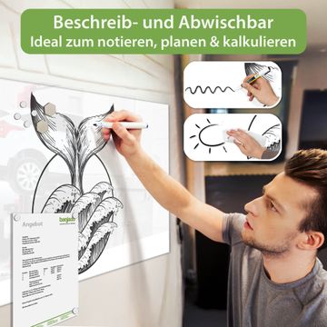 Auf der glatten Glasoberfläche lassen sich Termine, Rezepte oder Notizen ganz einfach mit Kreidestiften festhalten und rückstandslos entfernen. Starke Neodym-Magnete halten Ihre wichtigsten Erinnerungen sicher an Ort und Stelle. So entsteht Ihre ganz persönliche Ideenwand - jeden Tag neu.
