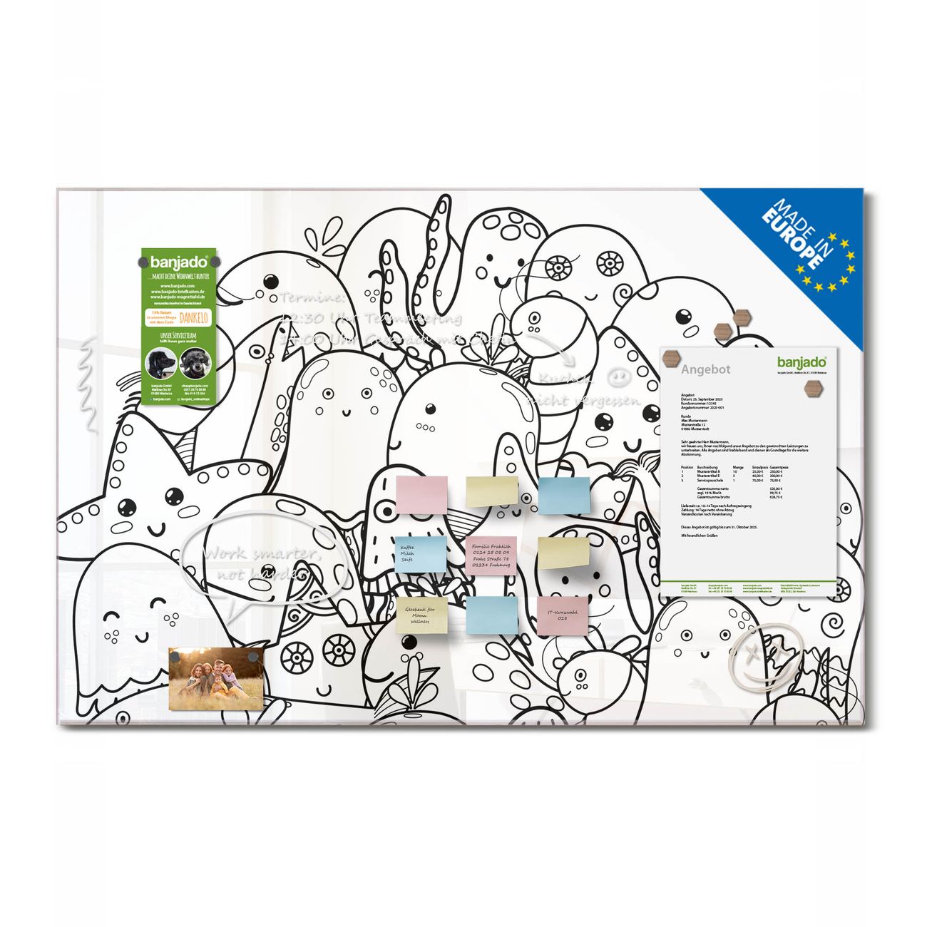 Jede Glas Magnettafel wird in unserer Werkstatt von Hand gefertigt und sorgfältig geprüft. So erhalten Sie ein echtes Qualitätsprodukt, das Funktion und Ästhetik perfekt vereint.?? Warum banjado?