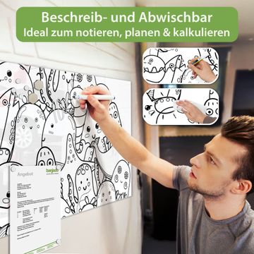 Auf der glatten Glasoberfläche lassen sich Termine, Rezepte oder Notizen ganz einfach mit Kreidestiften festhalten und rückstandslos entfernen. Starke Neodym-Magnete halten Ihre wichtigsten Erinnerungen sicher an Ort und Stelle. So entsteht Ihre ganz persönliche Ideenwand - jeden Tag neu.