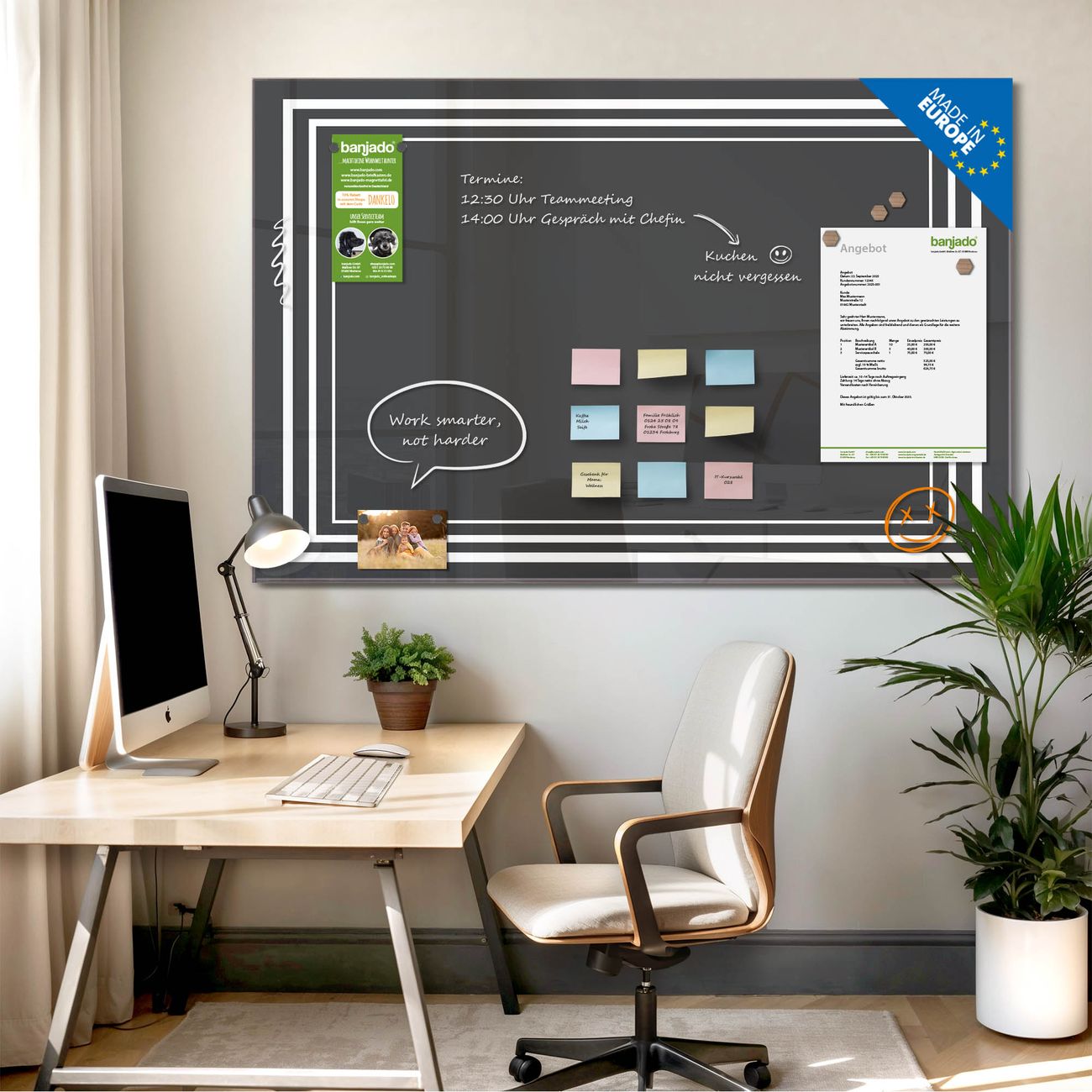 Jede Glas Magnettafel wird in unserer Werkstatt von Hand gefertigt und sorgfältig geprüft. So erhalten Sie ein echtes Qualitätsprodukt, das Funktion und Ästhetik perfekt vereint.?? Warum banjado?