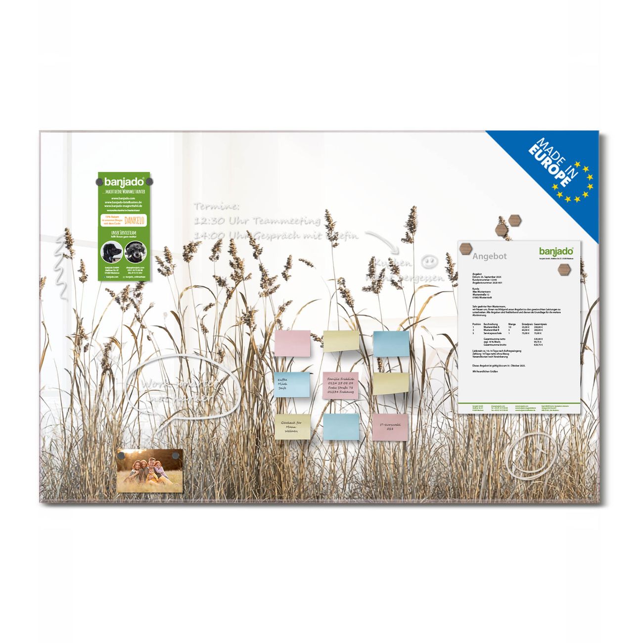 Ein Stück Design, das Ihren Alltag organisiert. Schreiben, heften, inspirieren - alles an einem Ort. Qualität, die man spürt. Montage leicht gemacht. Handwerk mit Herz - veredelt in Sachsen. Einzigartiges Design mit Motiv Motiv Wilde Gräser Beschreibbare Glasoberfläche, leicht zu reinigen Starke Magnetkraft durch Stahlrückwand Inklusive 4 Neodym-Magneten Flexible Montageoptionen Handveredelt in Sachsen - Qualität, die bleibt