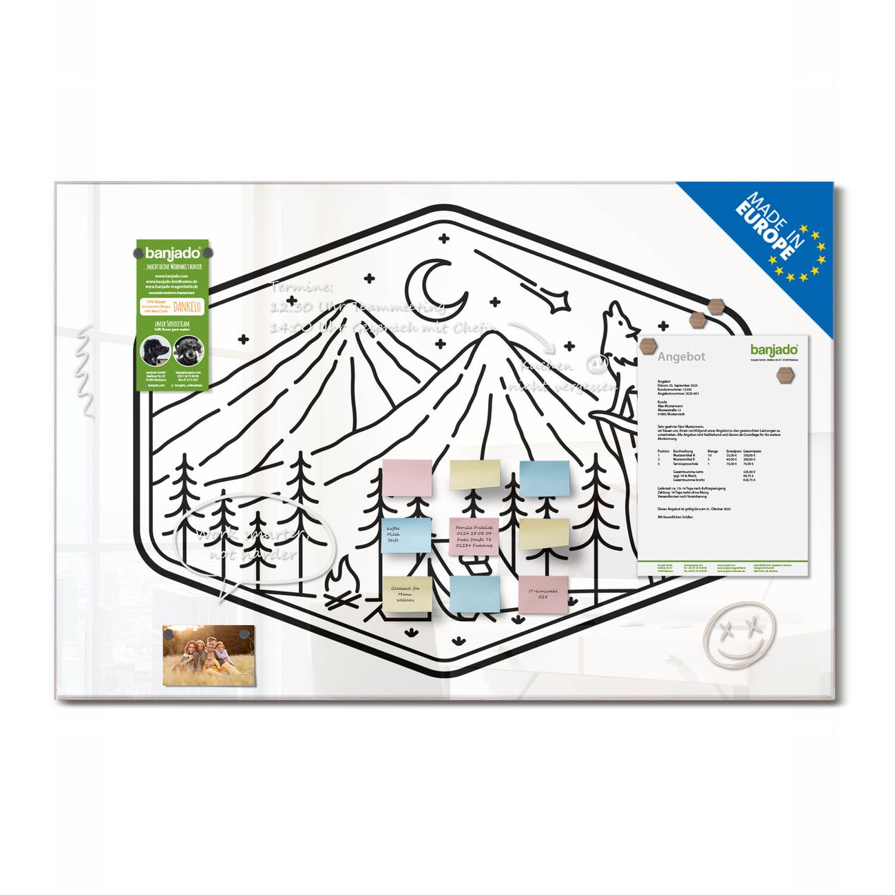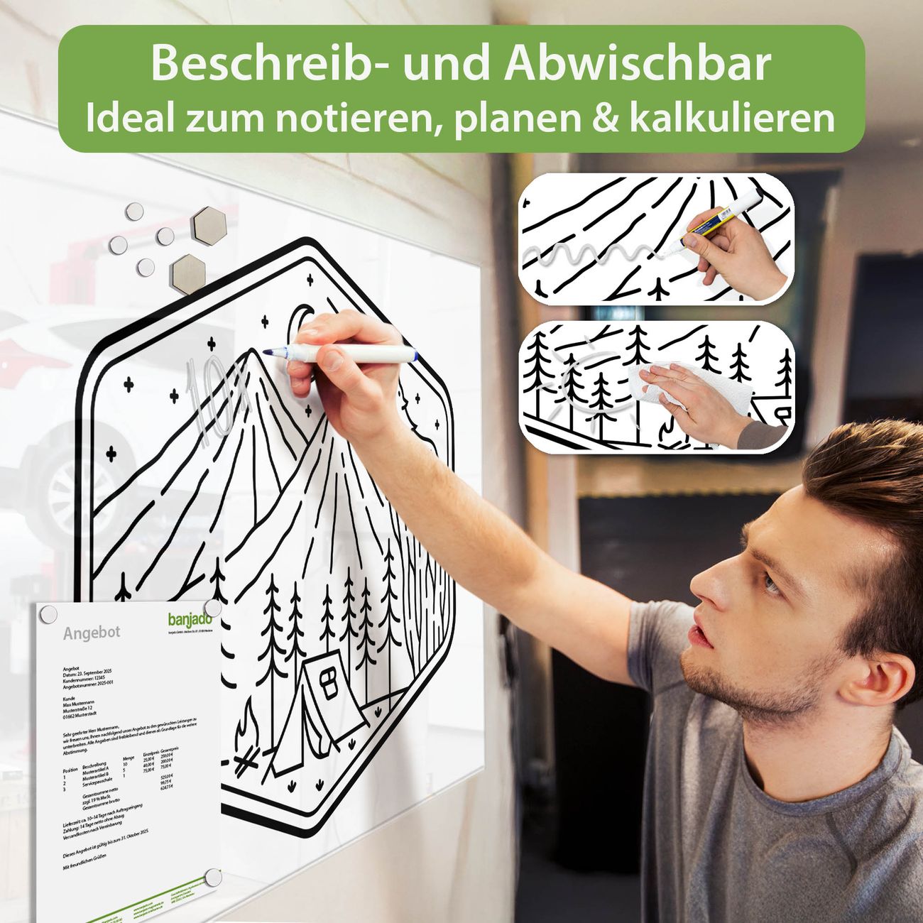 Jede Glas Magnettafel wird in unserer Werkstatt von Hand gefertigt und sorgfältig geprüft. So erhalten Sie ein echtes Qualitätsprodukt, das Funktion und Ästhetik perfekt vereint.?? Warum banjado?