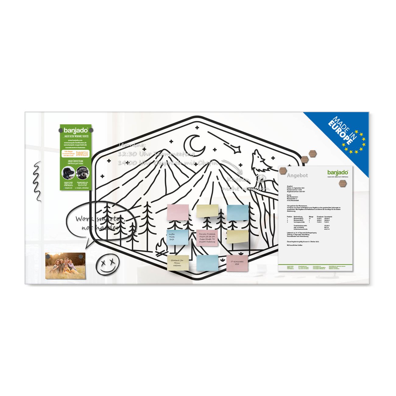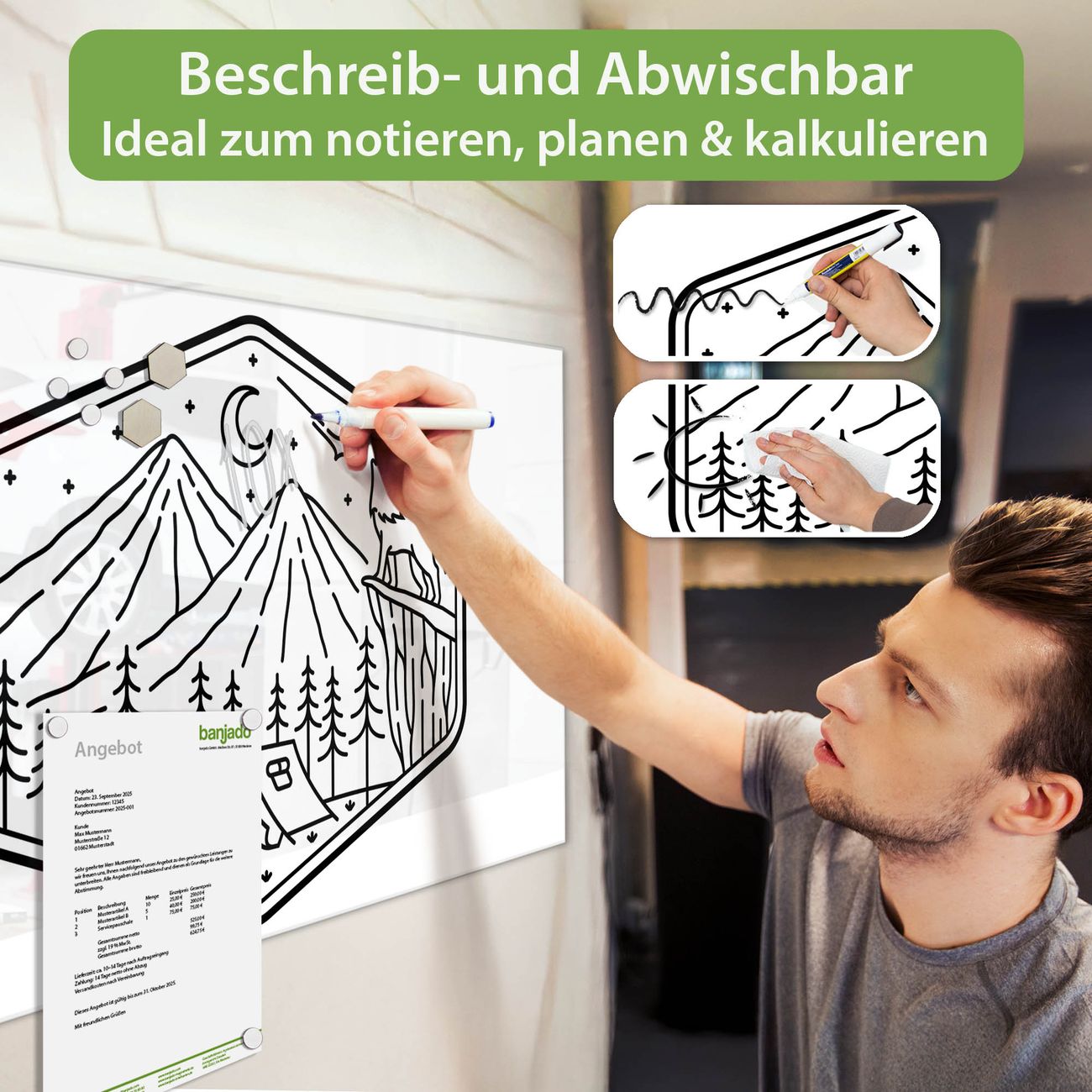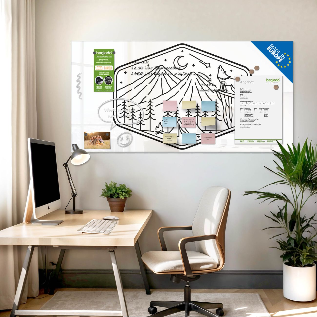 Jede Glas Magnettafel wird in unserer Werkstatt von Hand gefertigt und sorgfältig geprüft. So erhalten Sie ein echtes Qualitätsprodukt, das Funktion und Ästhetik perfekt vereint.?? Warum banjado?