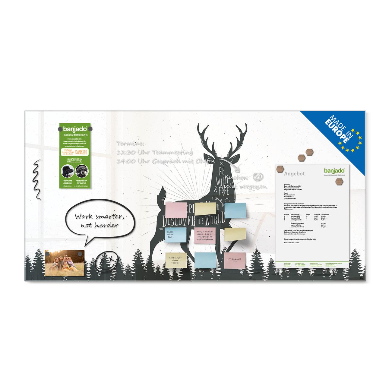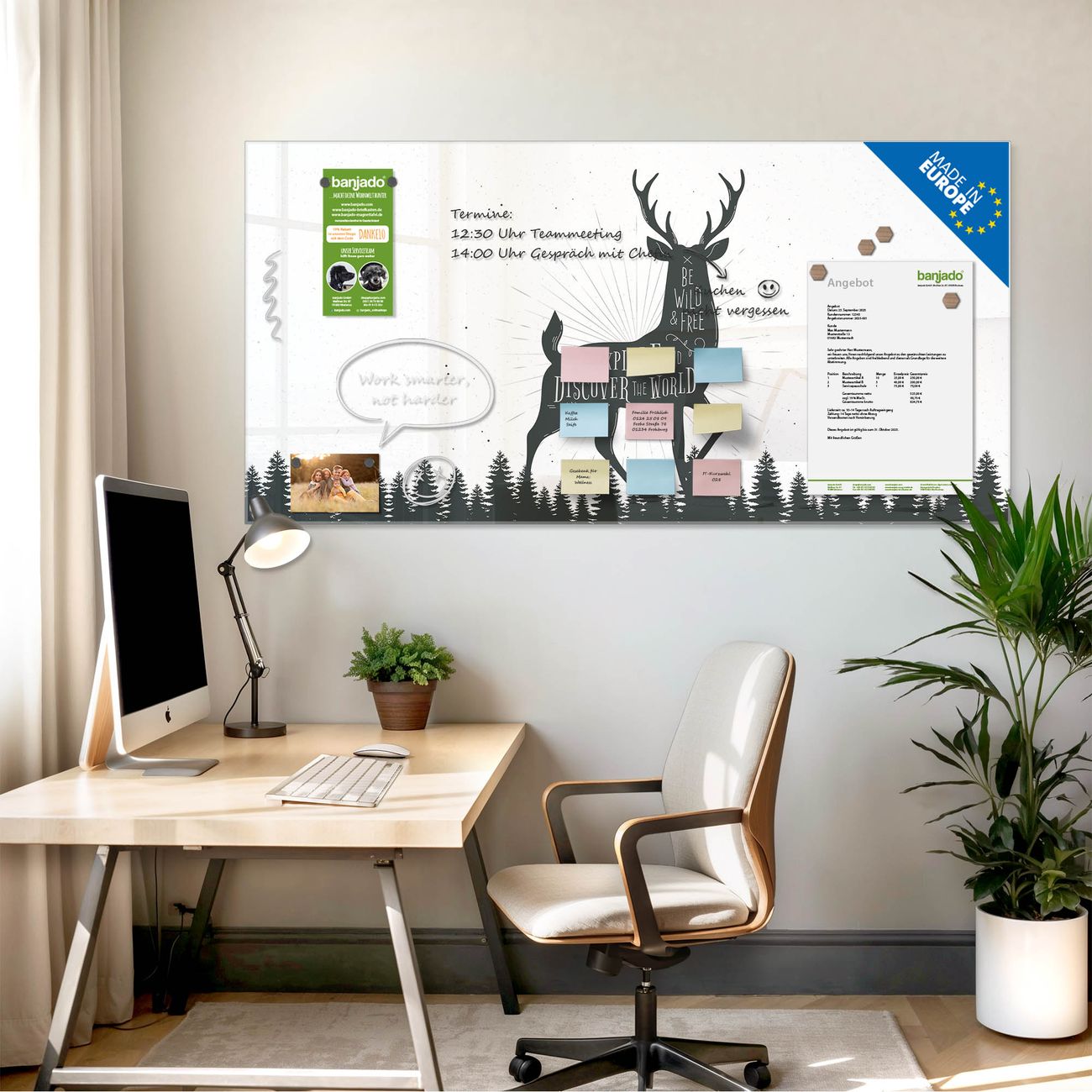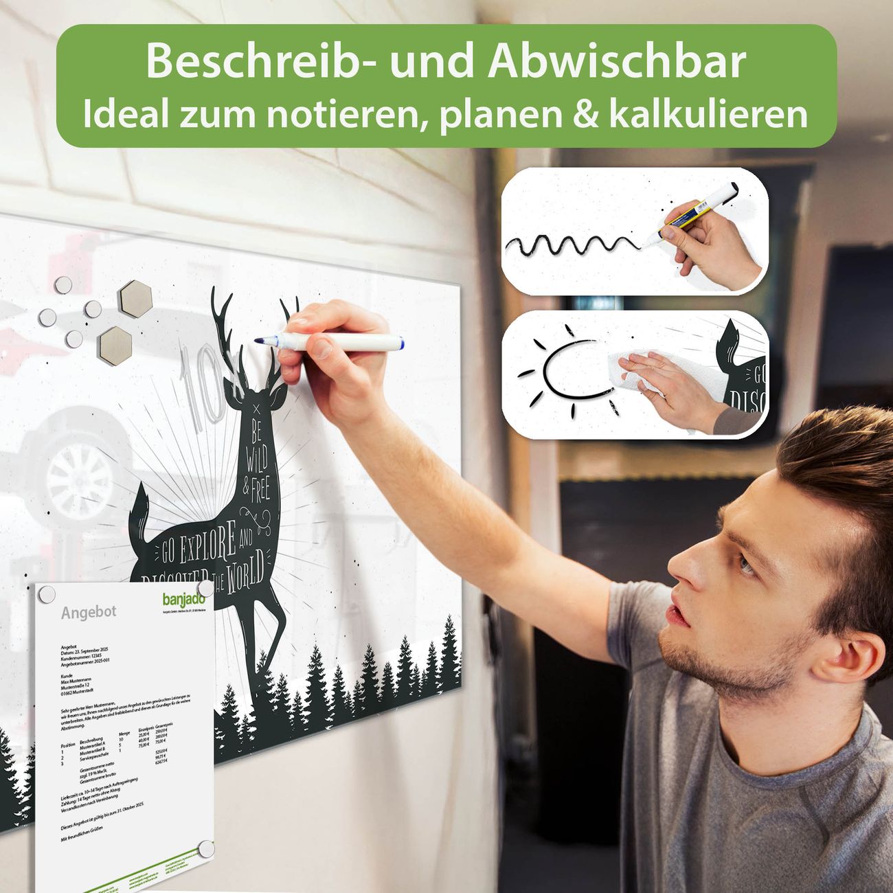 Jede Glas Magnettafel wird in unserer Werkstatt von Hand gefertigt und sorgfältig geprüft. So erhalten Sie ein echtes Qualitätsprodukt, das Funktion und Ästhetik perfekt vereint.?? Warum banjado?