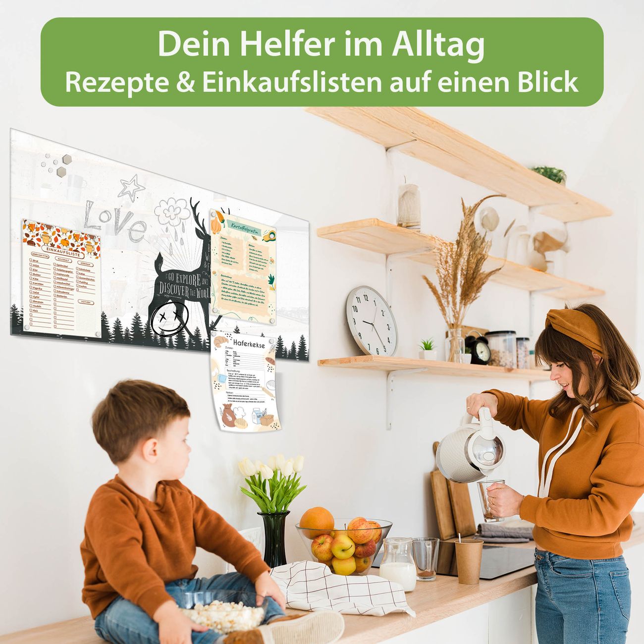Auf der glatten Glasoberfläche lassen sich Termine, Rezepte oder Notizen ganz einfach mit Kreidestiften festhalten und rückstandslos entfernen. Starke Neodym-Magnete halten Ihre wichtigsten Erinnerungen sicher an Ort und Stelle. So entsteht Ihre ganz persönliche Ideenwand - jeden Tag neu.