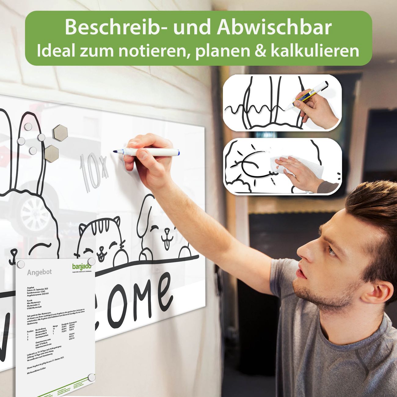Bitte beachten Sie, dass ausschliessliche spezielle Magnete an der Glastafel haften. Wir empfehlen banjado Neodym Magnete, diese sind durch uns auf Wirksamkeit geprüft.