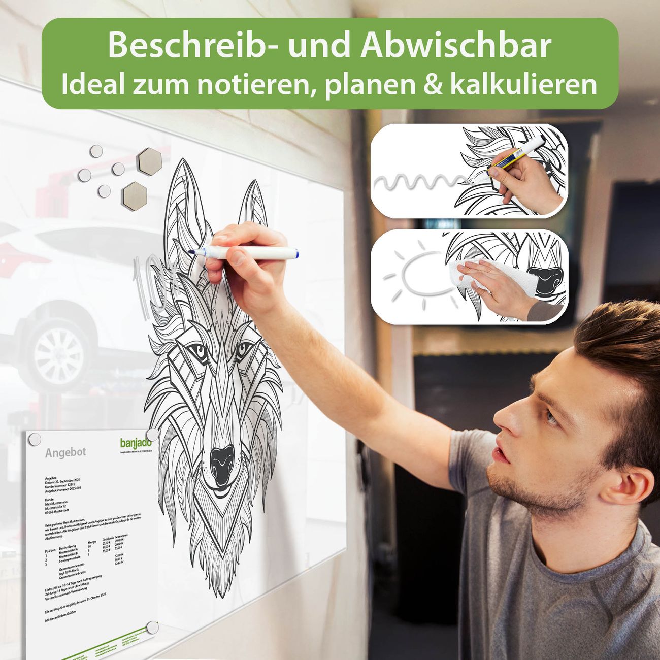 Jede Glas Magnettafel wird in unserer Werkstatt von Hand gefertigt und sorgfältig geprüft. So erhalten Sie ein echtes Qualitätsprodukt, das Funktion und Ästhetik perfekt vereint.?? Warum banjado?