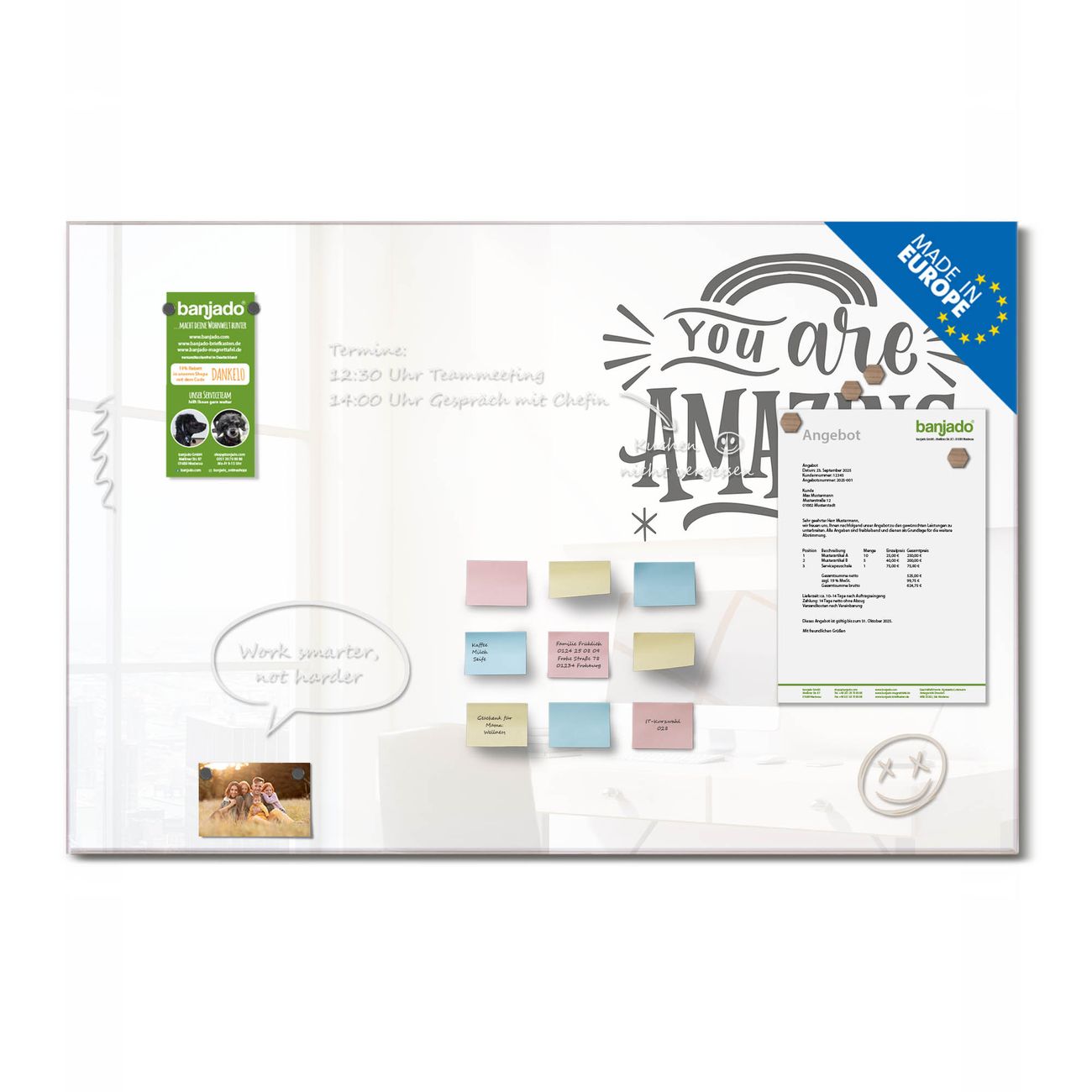 Jede Glas Magnettafel wird in unserer Werkstatt von Hand gefertigt und sorgfältig geprüft. So erhalten Sie ein echtes Qualitätsprodukt, das Funktion und Ästhetik perfekt vereint.?? Warum banjado?